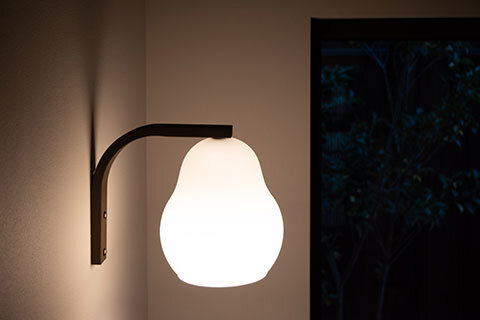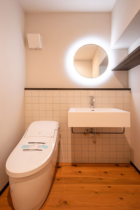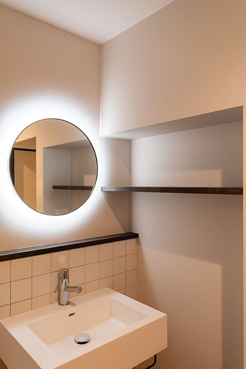 ラフランス型の照明や襖の曲線模様など、やさしいフォルムを随所に取り入れ、空間に柔らかな遊び心を散りばめました。水まわりも丸い鏡で統一し、バスルームの2つの鏡は磁石で着脱可能。使い方に合わせて位置を調整できる、ささやかな楽しさのある仕掛けです。