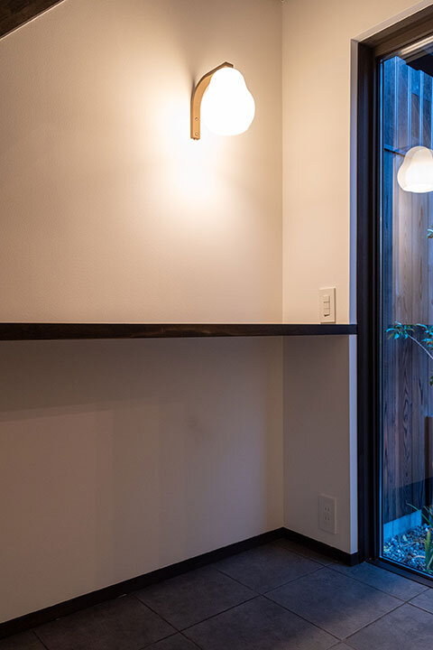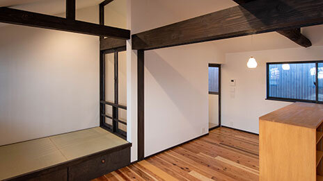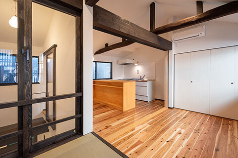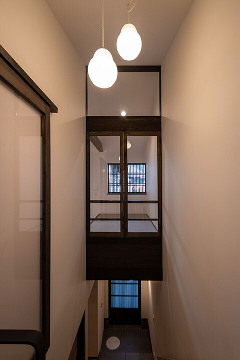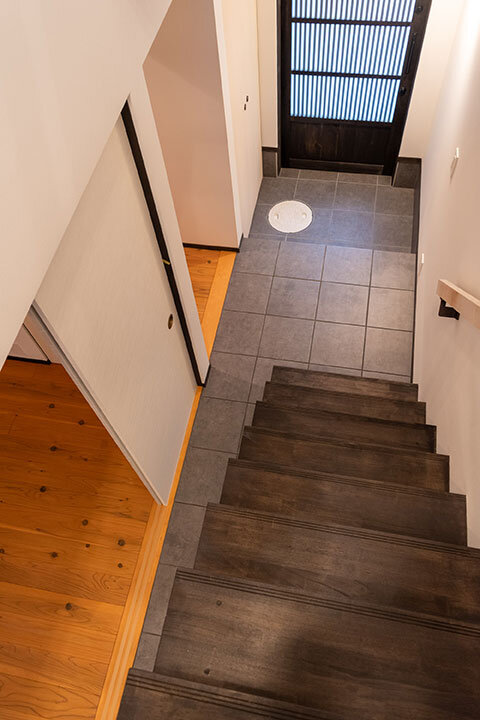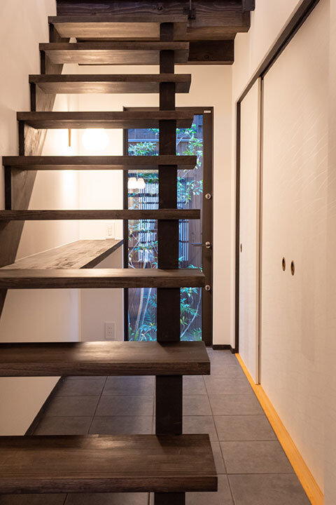 かつてのトオリニワを吹き抜け階段として再構成し、足元には土間の質感を残した床を採用。1階の土間には庭へとつながるガラス扉を設け、奥まで光が届く“抜け感”のある空間に。屋内と庭がゆるやかにつながり、通り庭の名残が息づく、心地よいひろがりが生まれました。