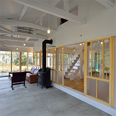 薪ストーブのインナーテラスから庭を自由に行き来できる、のびのびとした住まい。