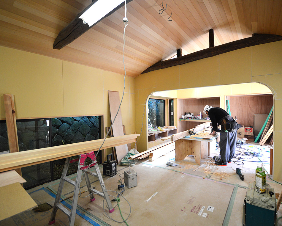 「古くても状態が良かったり、直せそうなものは出来る限り残して使う」という考えのもと、柱や梁だけでなく、家具・建具なども再利用して、年月とともに増した「経年美」や「古いものの味わい」を大切に建物をつくります。 -