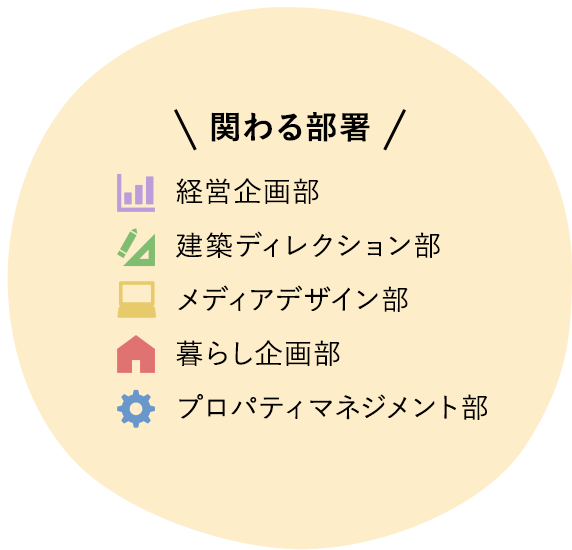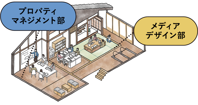 賃貸収益事業(シェアハウス、コワーキング、バイクパーキング、投資物件など)の運営、社有賃貸の管理、賃貸仲介、不動産の有効活用提案や請負工事、賃貸管理を含む投資物件の開発、新規物件の開発、コミュニティ管理を行っています。またマンスリー賃貸の運営や空家管理サービスの運営も担当している部署です。不動産を点だけで捉えず、面として捉え、コミュニティ形成を基盤にまちづくりに貢献を目指す仕事です。