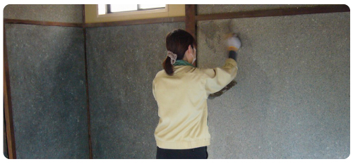 PREV NEXT 22010年4月20日 みんなで壁剥がし <もくもくと> 先生と同じようにやっているつもりですが・・・ 一生懸命塗るも、なんだかムラになってる? なかなか難しいです。 先生が後ろから優しく指導。 「僕も。」と、工務担当の藤井が参戦。 ・・・そんな真ん中から? 思い思いに塗りすすめる2人。 小屋工業さんは、塗ったカベトレールをコテでこそいで、綿壁(ワタカベ)を剥がしていきます。 3人並んで作業に没頭。 PREV NEXT