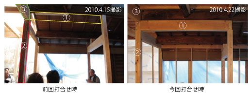 写真右側は、前回の打合せ時に補強の確認がされていた部分。前回の打合せで確認された点が、大工さんの仕事によって1週間ですっかり修正されています。