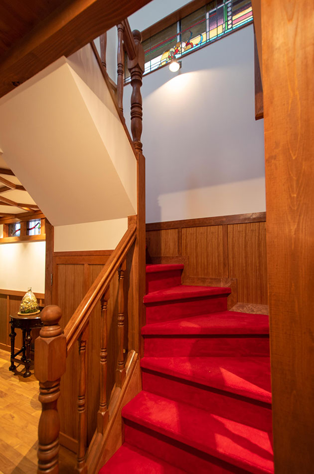 赤い絨毯のやさしさに包まれながら2階へ上がると和の世界へ