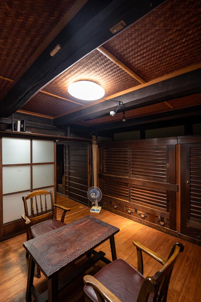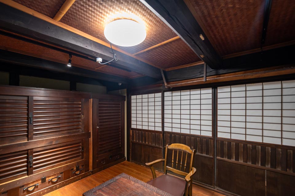 天井が高く、開放感のある空間が広がるのも織屋建の特徴です。この町家には織屋建の美しさや質感、そして独特の味わいが残されており、梁や柱、箪笥、建具などもそのまま活かされています。