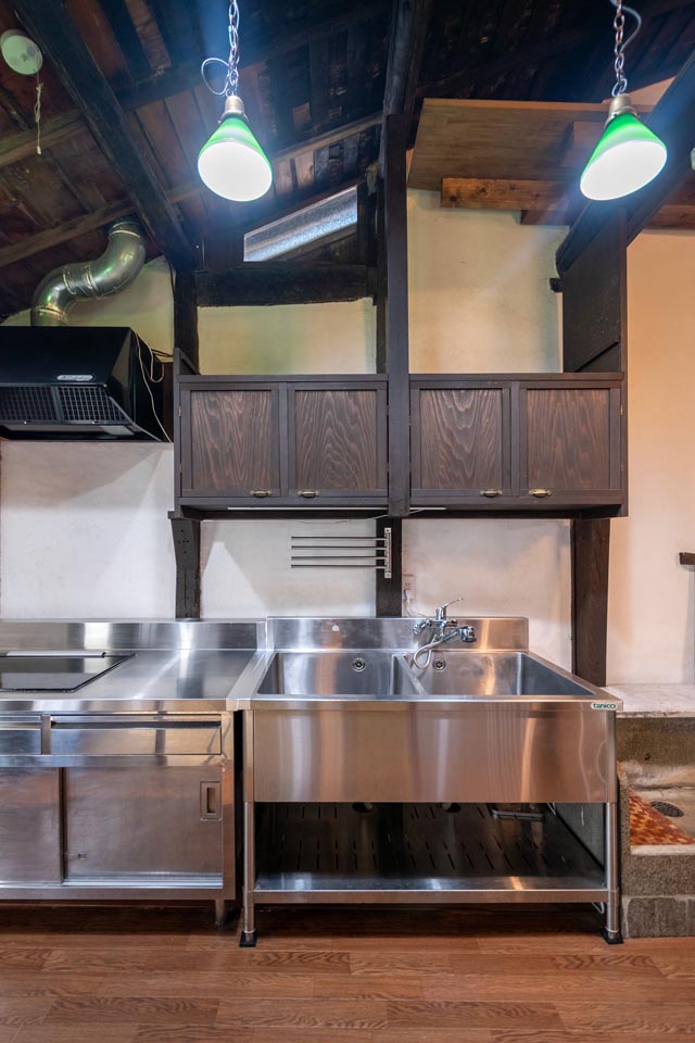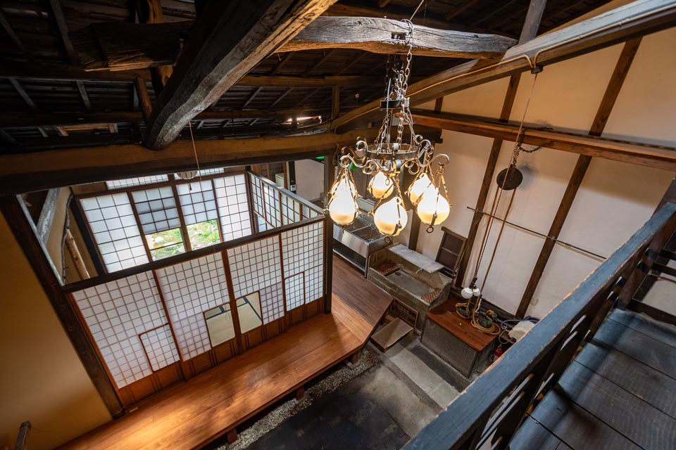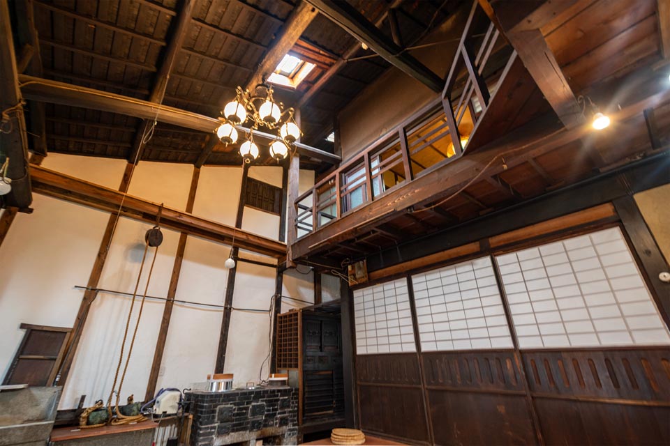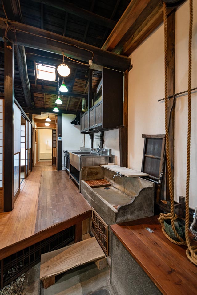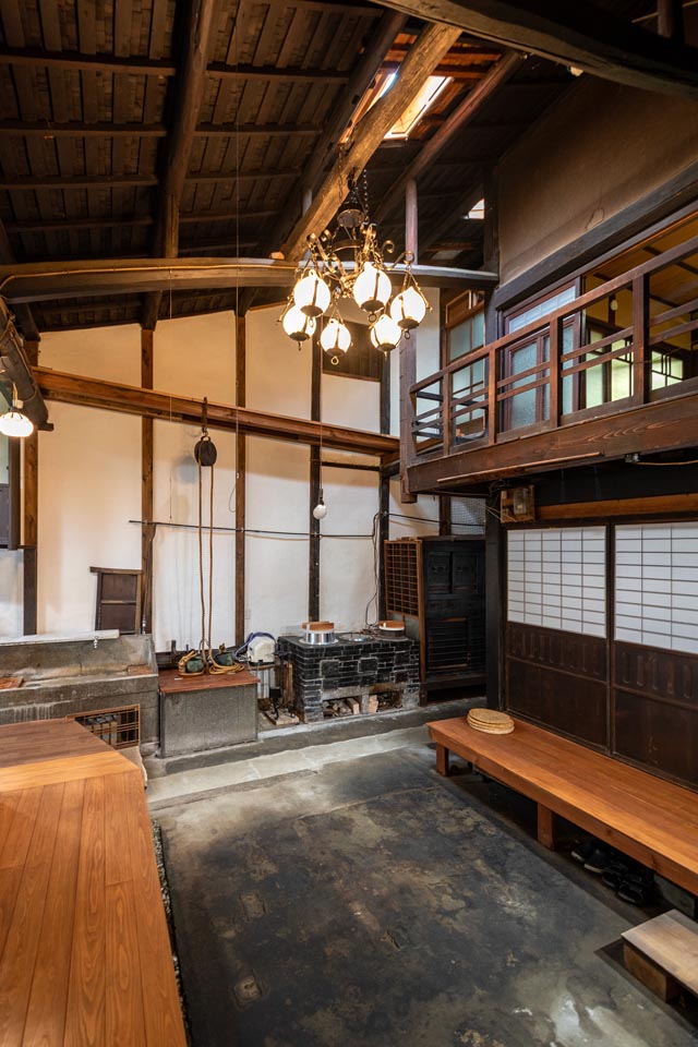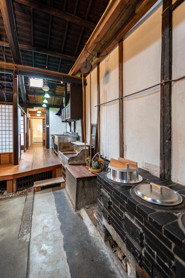 玄関から奥へと続く和室の並び、通り庭や井戸、おくどさん、火袋(吹抜)など、昔ながらの造りが随所に残されています。