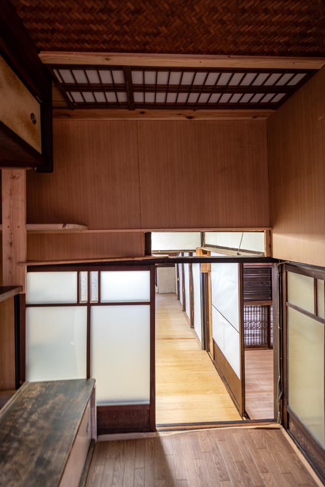 織屋建(着物の帯などの機織り工場と住居を兼ねた町家)は、機織りの音が通りに響かないよう、作業場を奥に配置するという独特の構造を持っています。