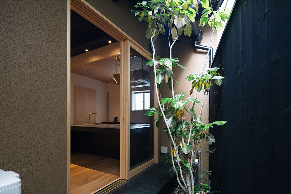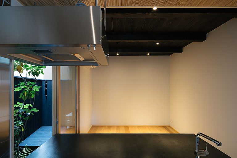 通り庭のように奥へと延びる動線を抜け、一段上がると、開放感あるリビングと庭が広がります。床の高さに変化をもたせた構成が、視覚的にも気持ちのよいリズムを生み出します。