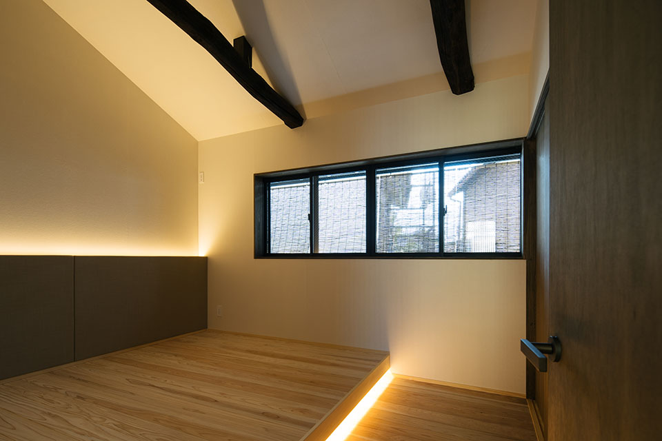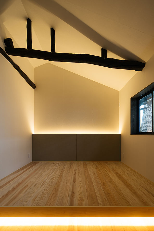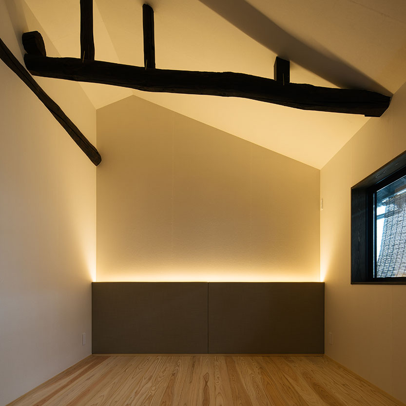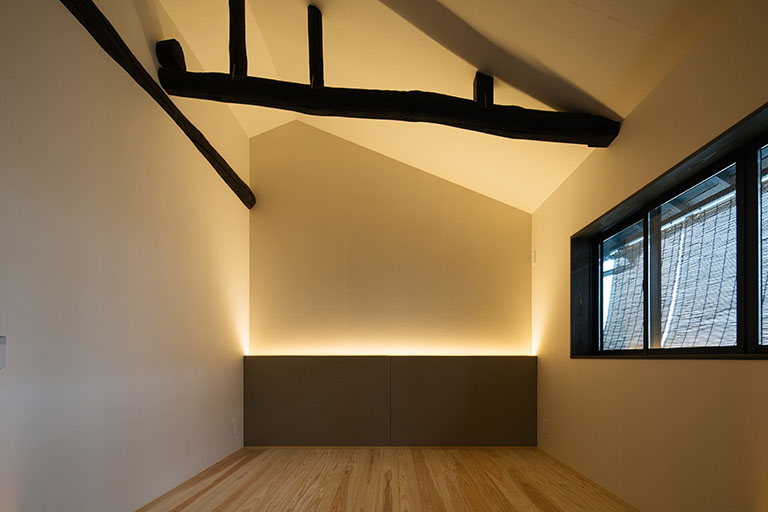 2階の寝室には、天井に仕込まれた間接照明がやさしく光を拡散し、静けさと温かさが共存するナイトタイムを演出。