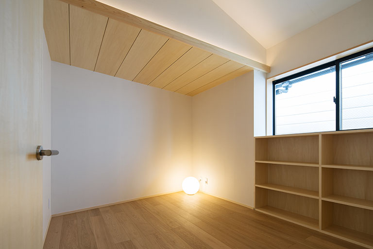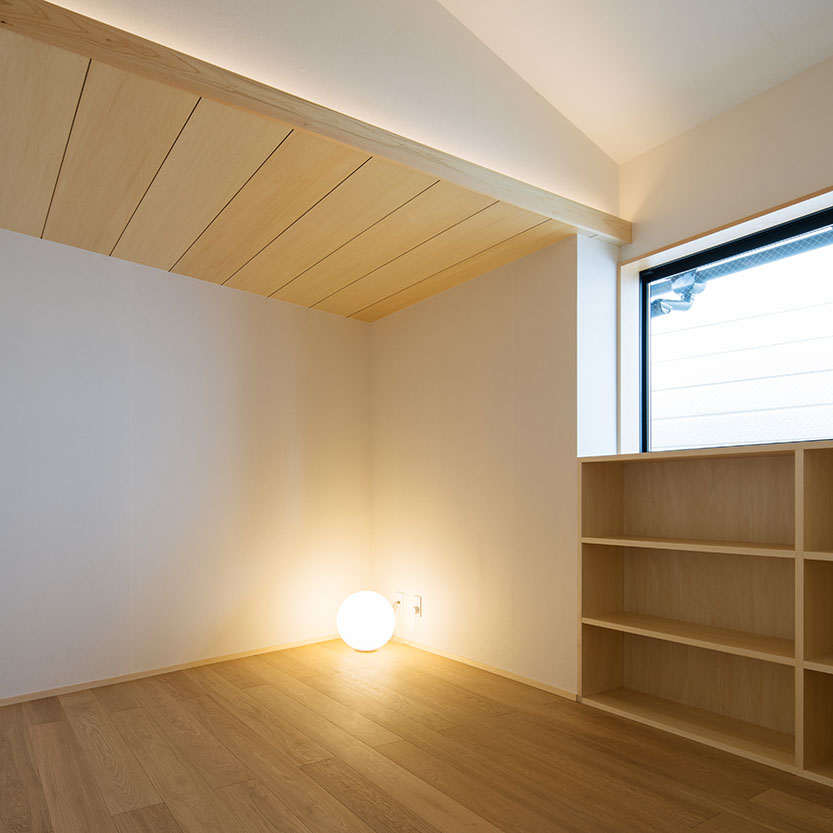 2階寝室にはクッション付きのヘッドボードを備え、ベッドまわりでゆったりと過ごせる設えに。やわらかな間接照明が、光をふんわりと上へ広げながら、空間全体に静かな温もりをもたらします。