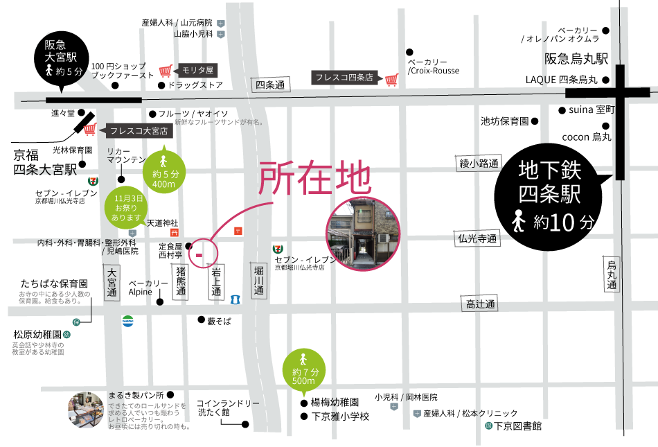 交 通 | 阪急京都線「大宮駅」2-A出口 徒歩約6分 |