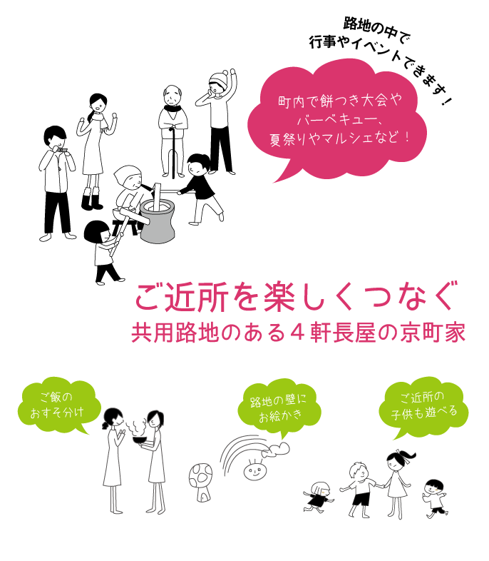大人同士も挨拶を交わしたり、ご飯をおすそわけしたり、ほどよい距離感でご近所と繋がれる古くて新しいリノベーション京町家です。