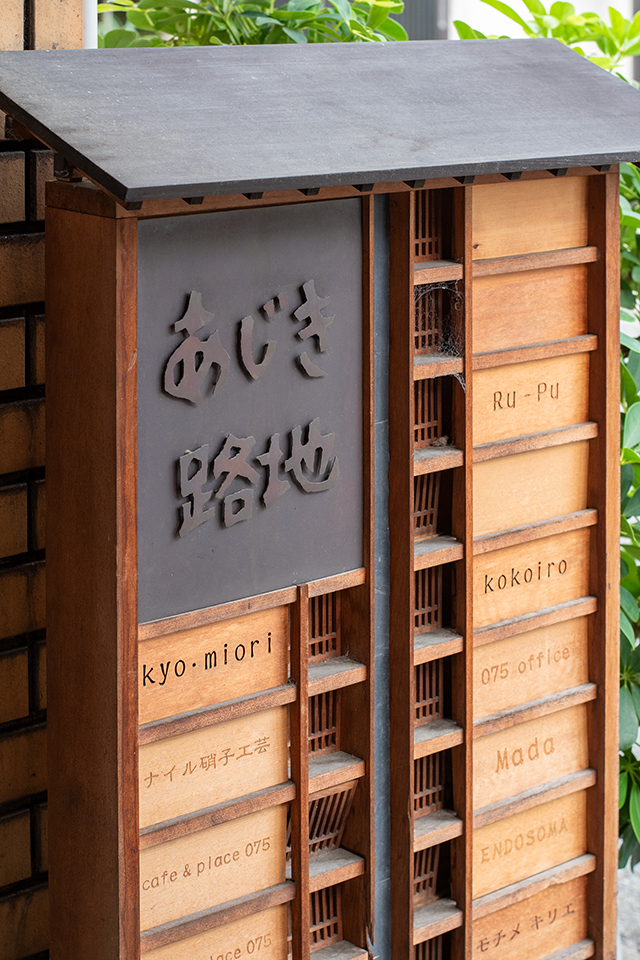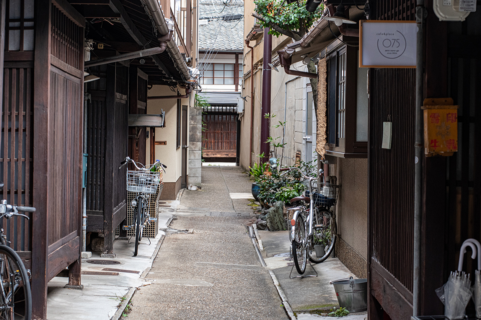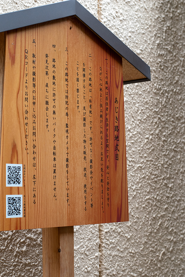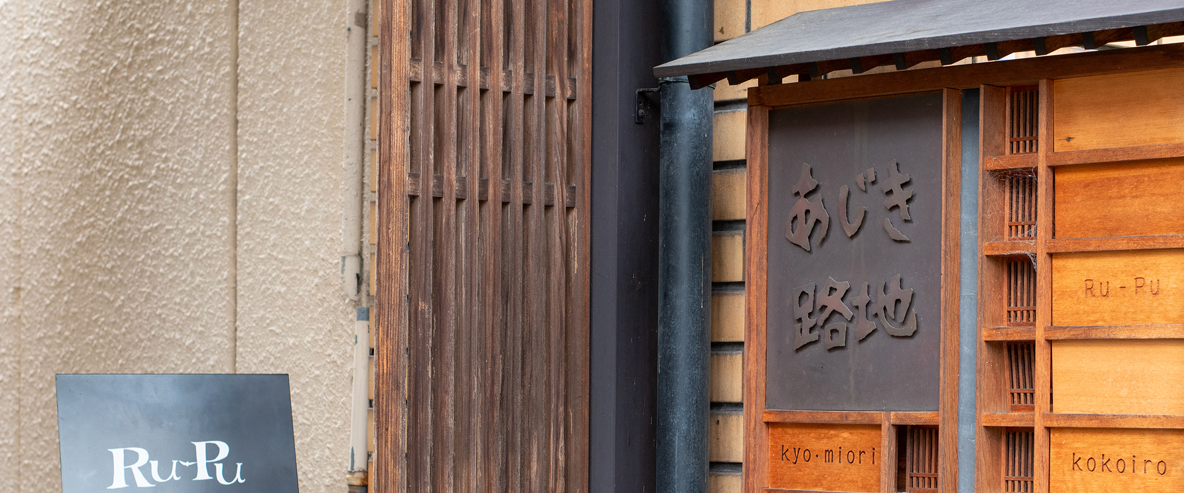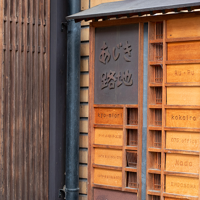 あじき路地の入口。近くには建仁寺や六波羅蜜寺がある清水五条に位置します。一歩足を踏み入れると、閑静で落ち着いた景色が広がります。