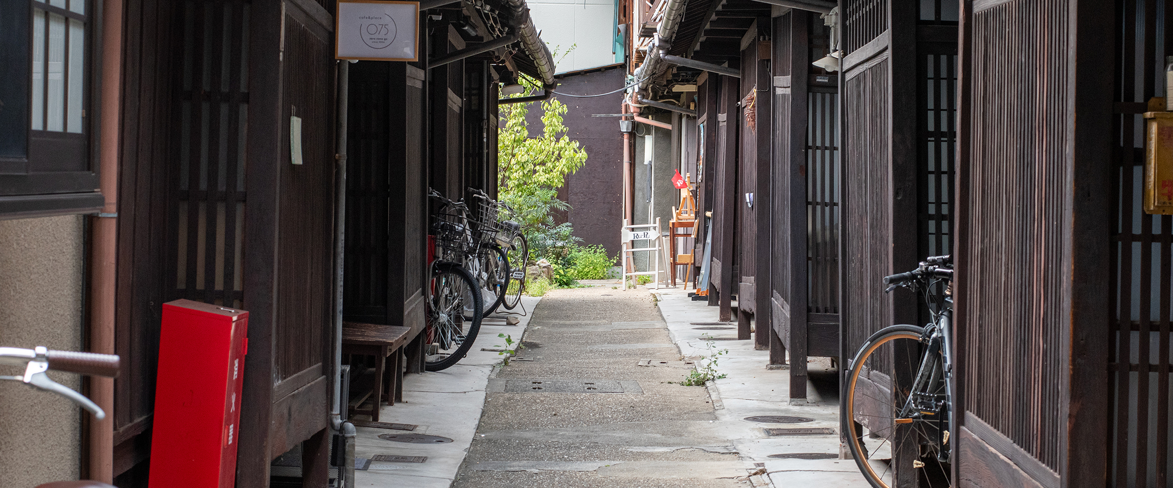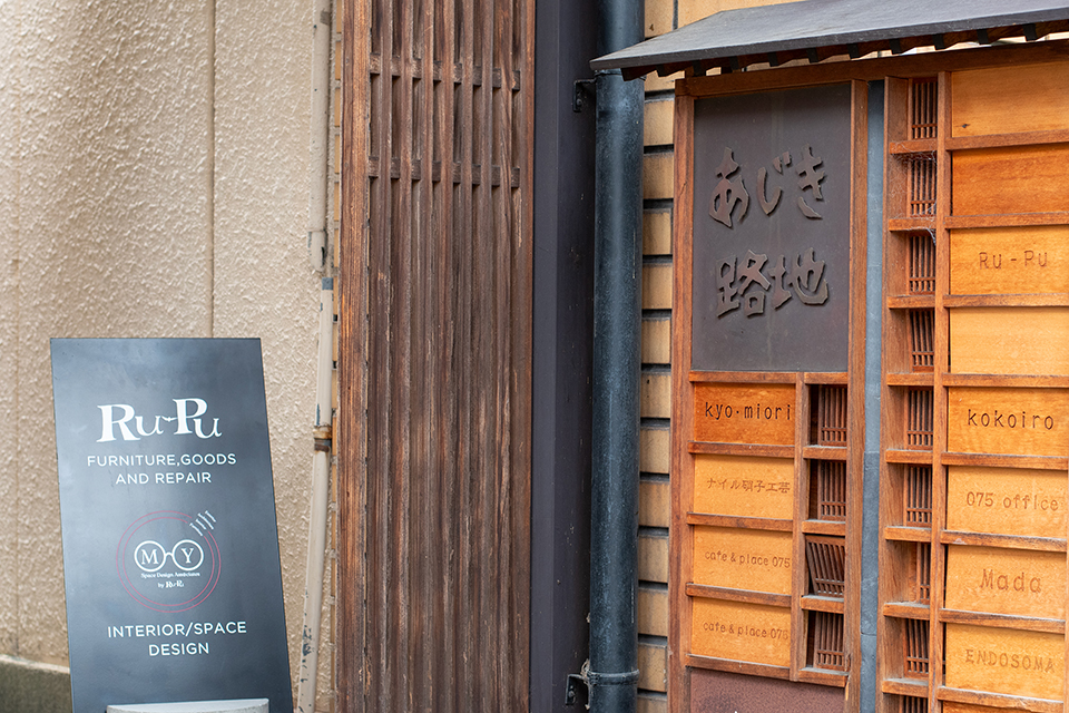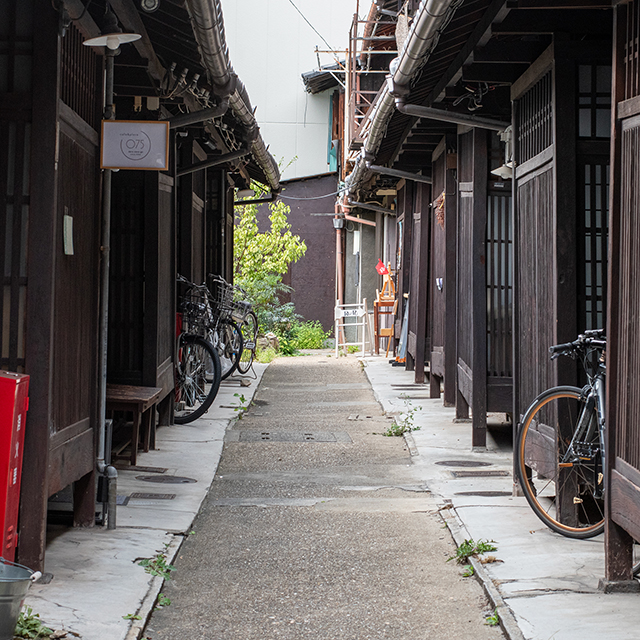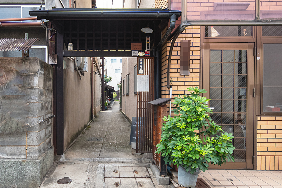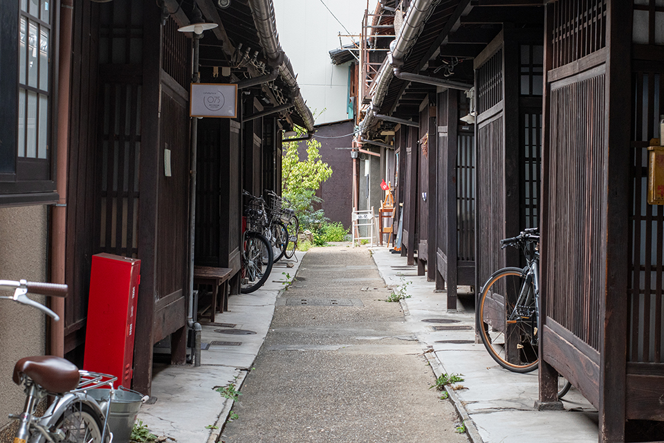あじき路地の入口。近くには建仁寺や六波羅蜜寺がある清水五条に位置します。一歩足を踏み入れると、閑静で落ち着いた景色が広がります。