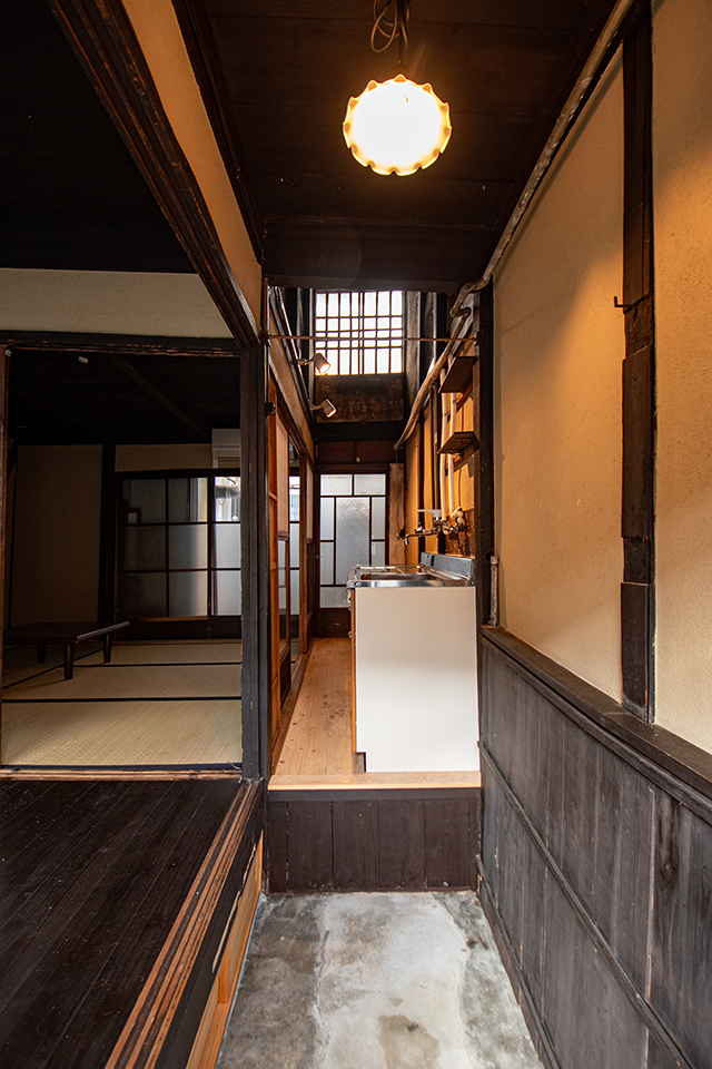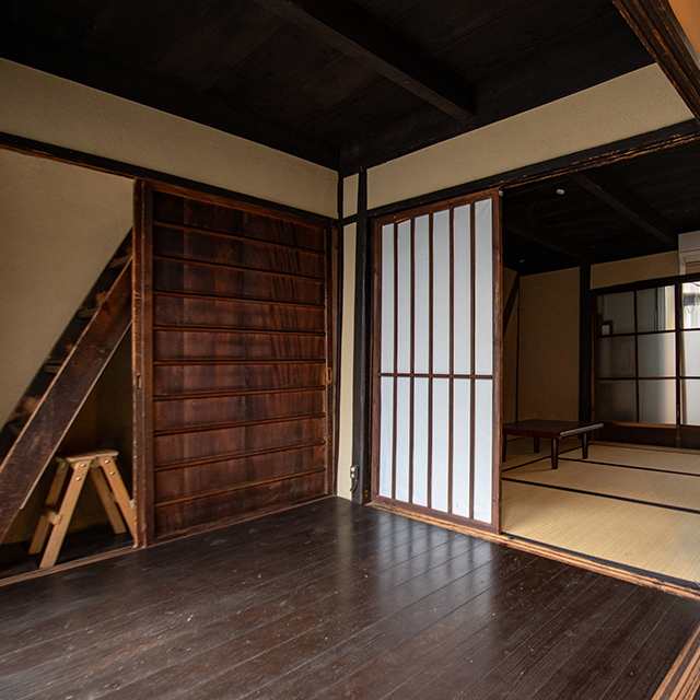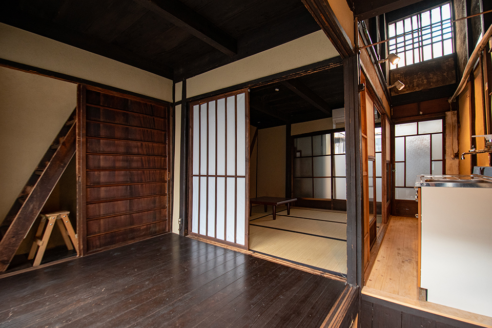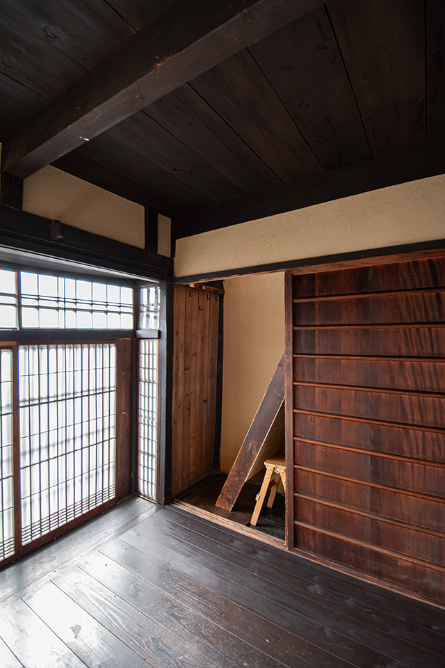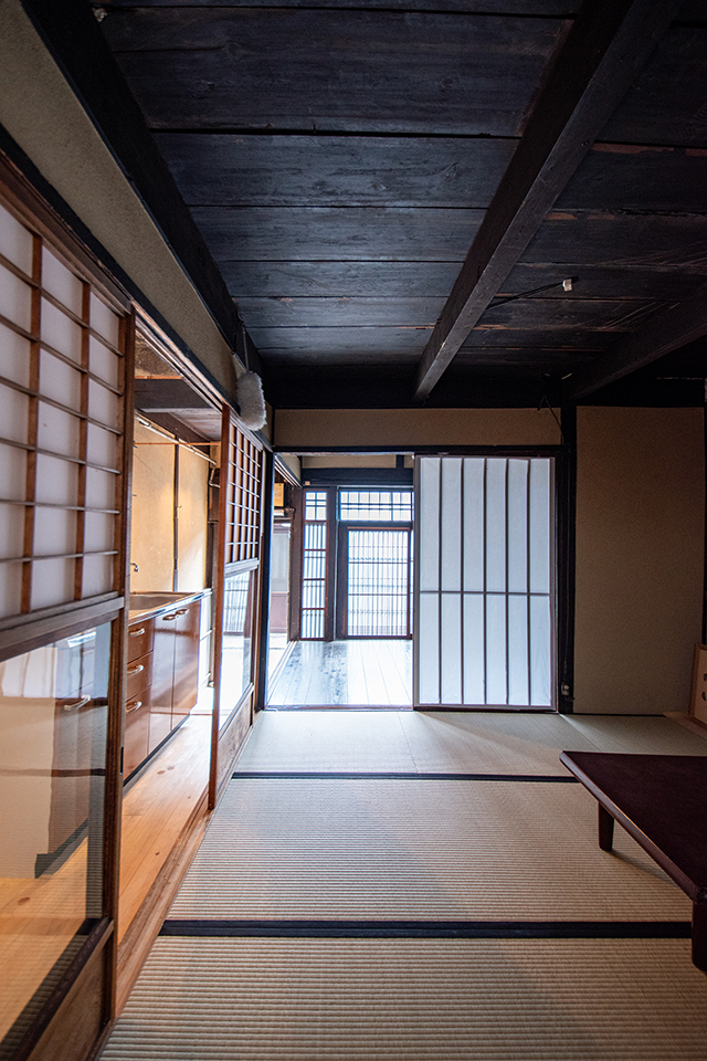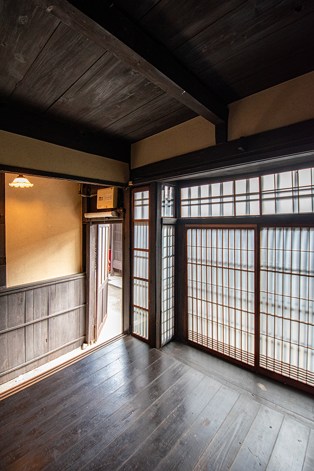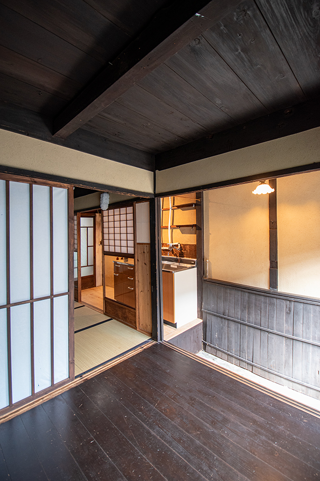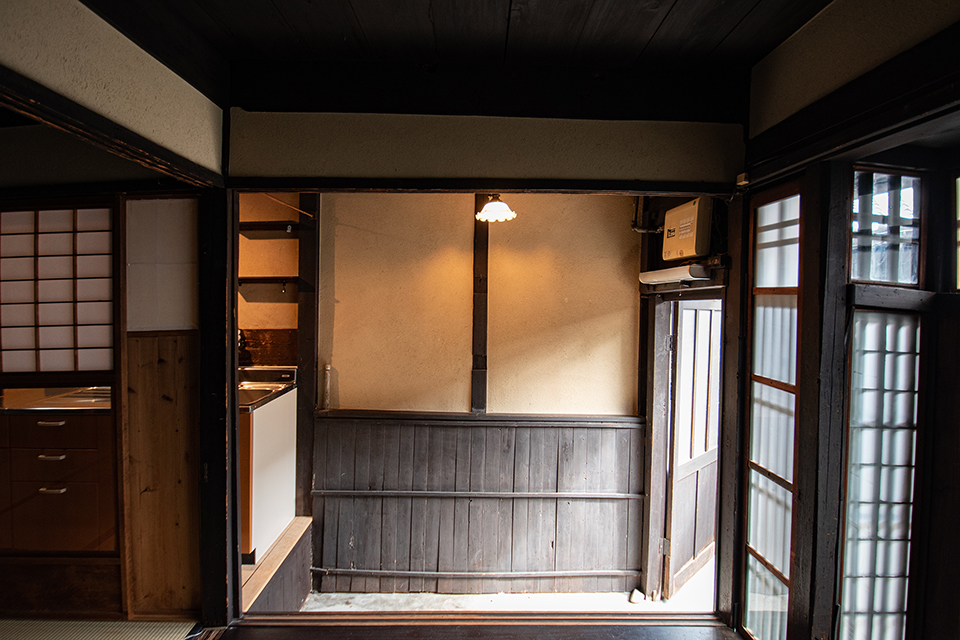 京町家らしい外観に、店の間、奥の間、通り庭と京町家らしい要素と趣が残る造りになっています。外観の格子は、外部の視線が入らないように配慮されています。室内は、階段や建具など、建てられた当時のものがそのまま使われ、味わい深い印象です。また、玄関が南向きのため、特に店の間は明るく柔らかい光が室内に入り込みます。