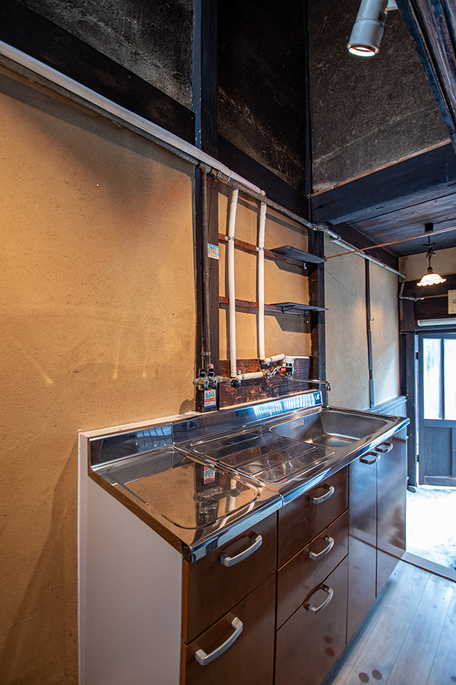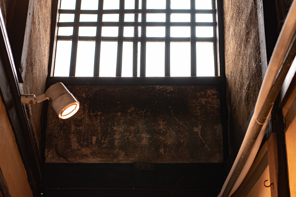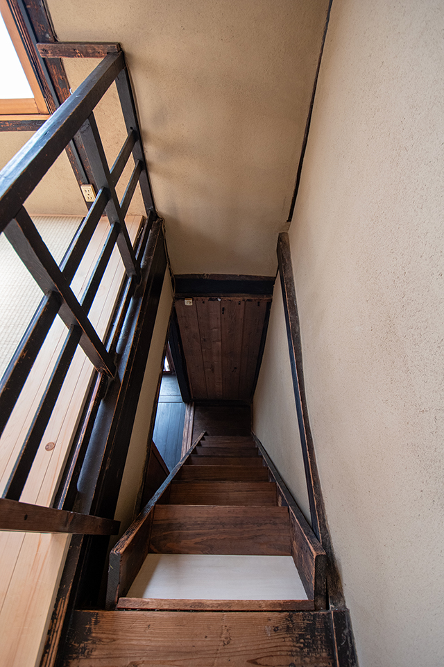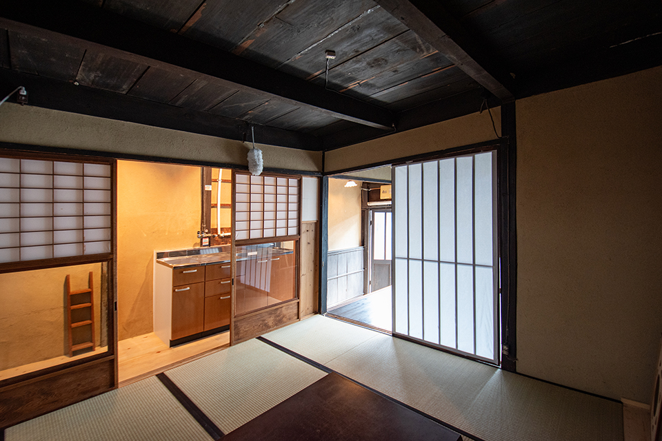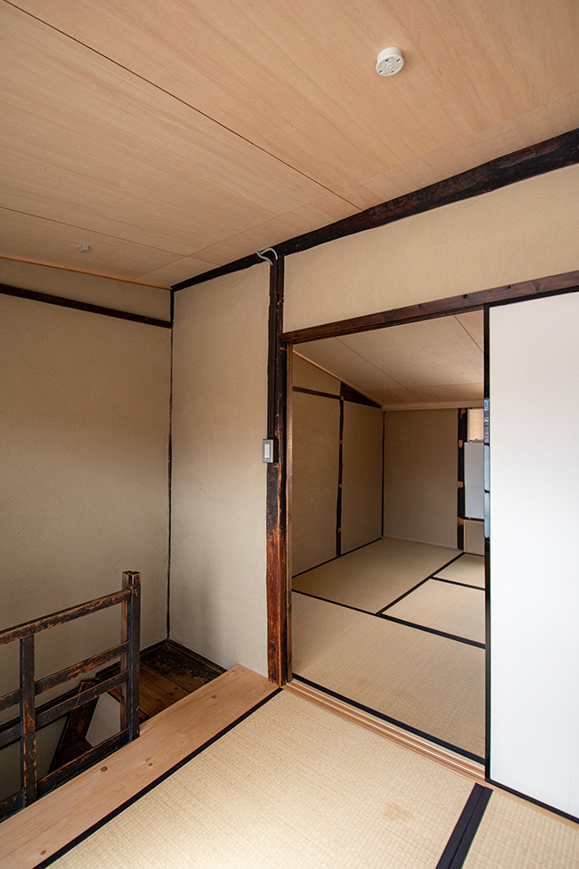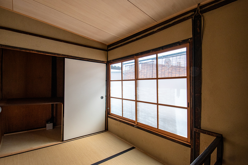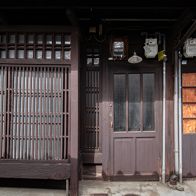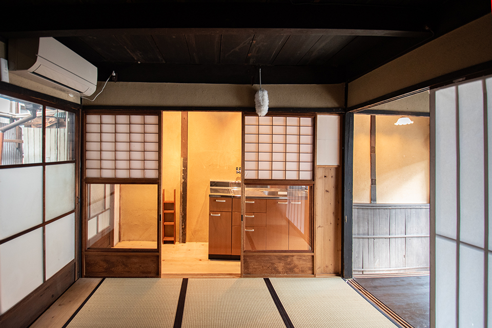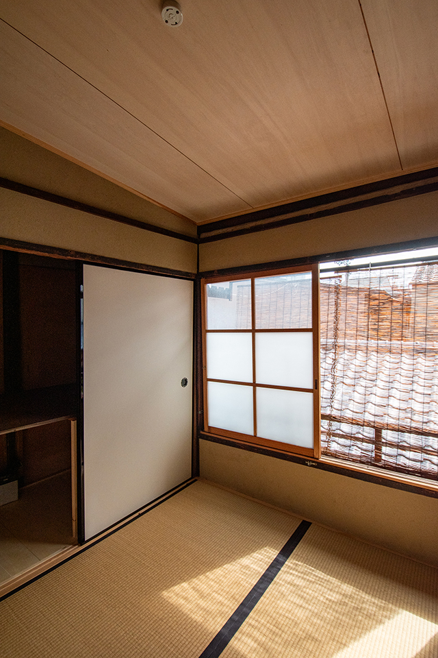 京町家らしい外観に、店の間、奥の間、通り庭と京町家らしい要素と趣が残る造りになっています。外観の格子は、外部の視線が入らないように配慮されています。室内は、階段や建具など、建てられた当時のものがそのまま使われ、味わい深い印象です。また、玄関が南向きのため、特に店の間は明るく柔らかい光が室内に入り込みます。