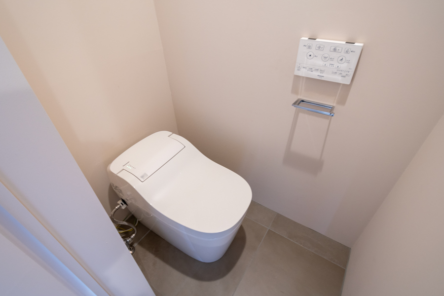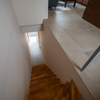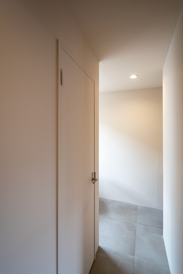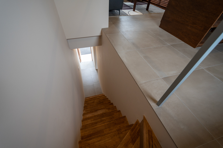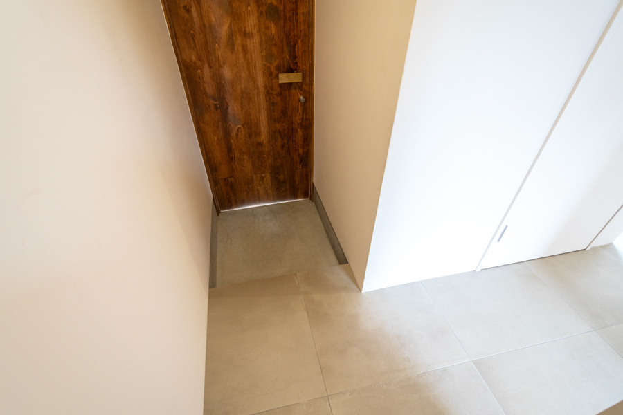 静かな住宅街に現れる、大きな窓とあずき色の外観が印象的な一軒家。室内に足を踏み入れると、白を基調とした明るい室内にタイル張りの床が高級感あふれるしつらえです。