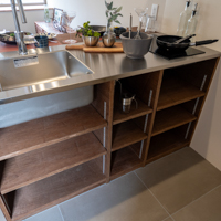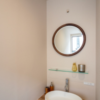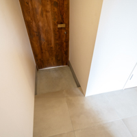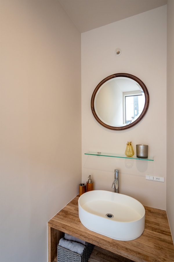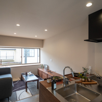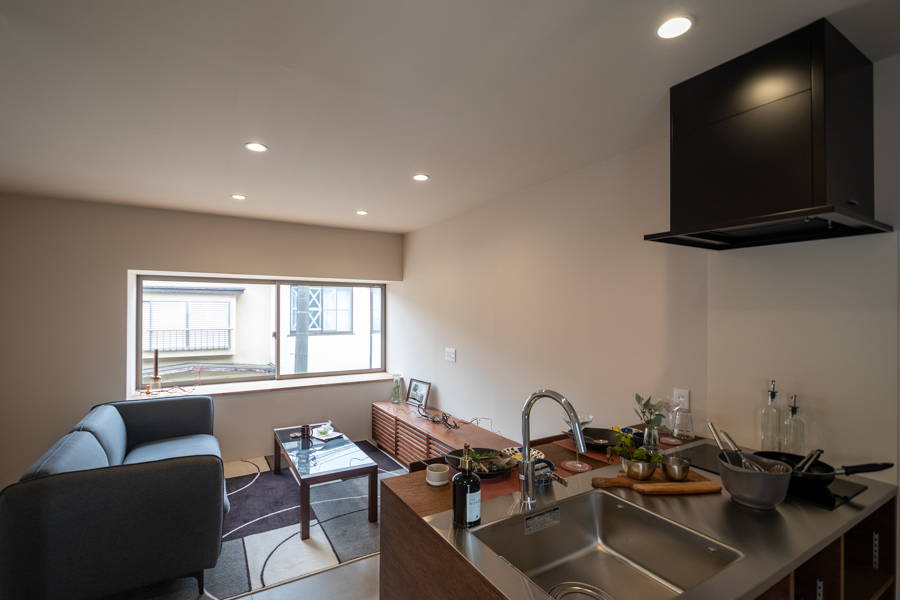 2階に上がると、明るいリビング空間と温かみある木の造作キッチンが出迎えてくれます。開放的な北向きの大きな窓から光がたっぷり差し込むLDKは、心地よさと機能性を両立しています。1LDKにモダンなデザインのフルリノベーションを施し、住まう人の感性やライフスタイルに寄り添う「ちょうどいい余白」を大切にした空間です。