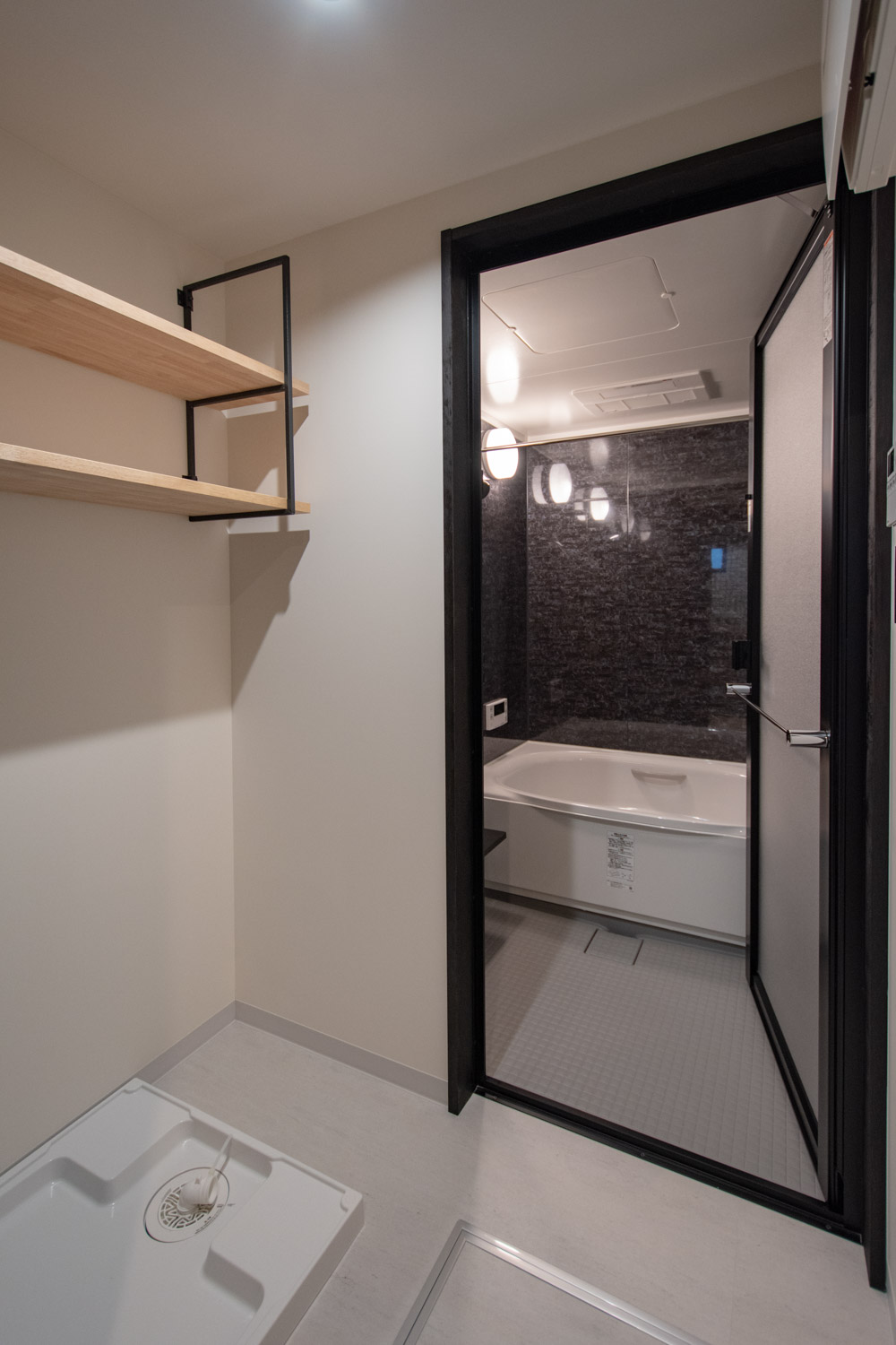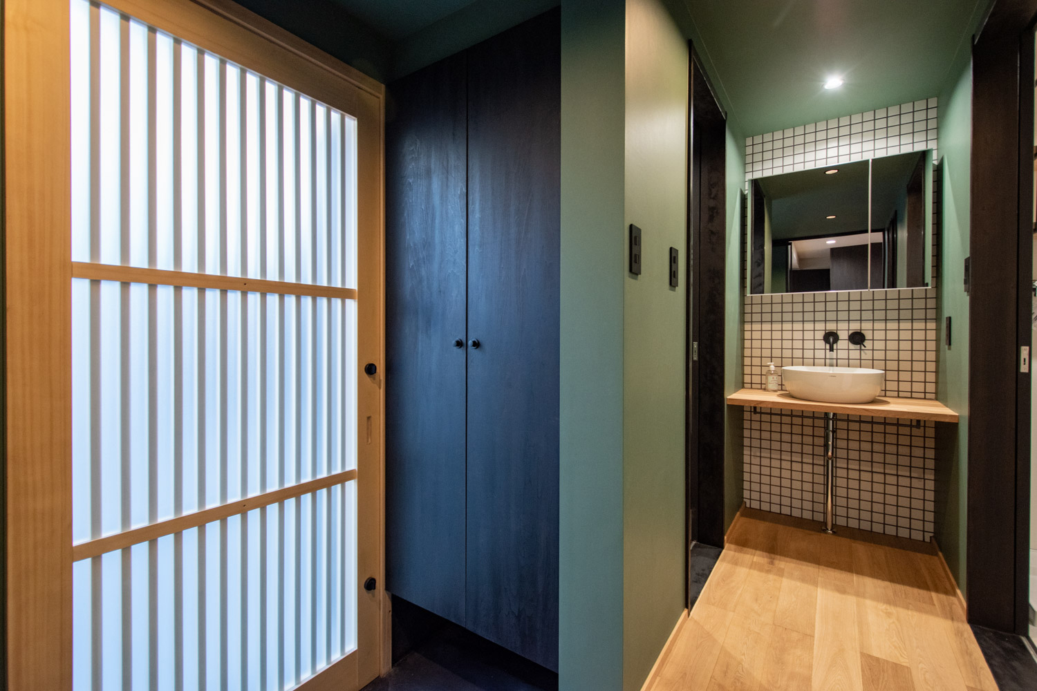 OFFの日はいつもよりゆっくりと。ミラーキャビネットを設けた洗面台では身支度も心地よくスムーズに。