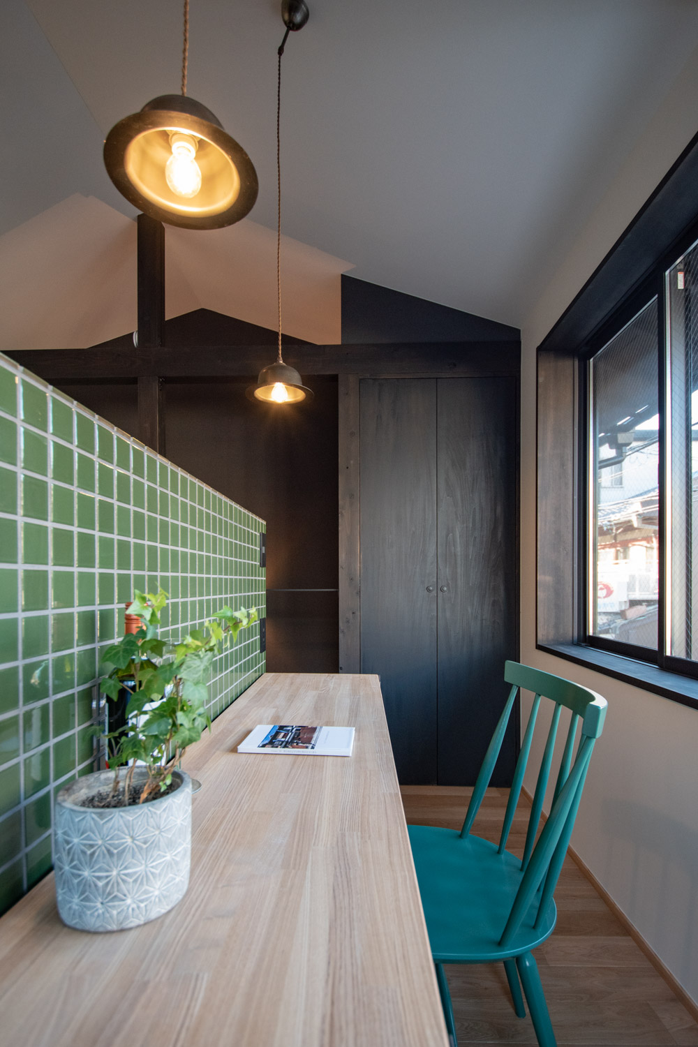 集中力が必要なデスクワークは窓辺のワークスペースで。外の光を感じながらONの時間が始まる。