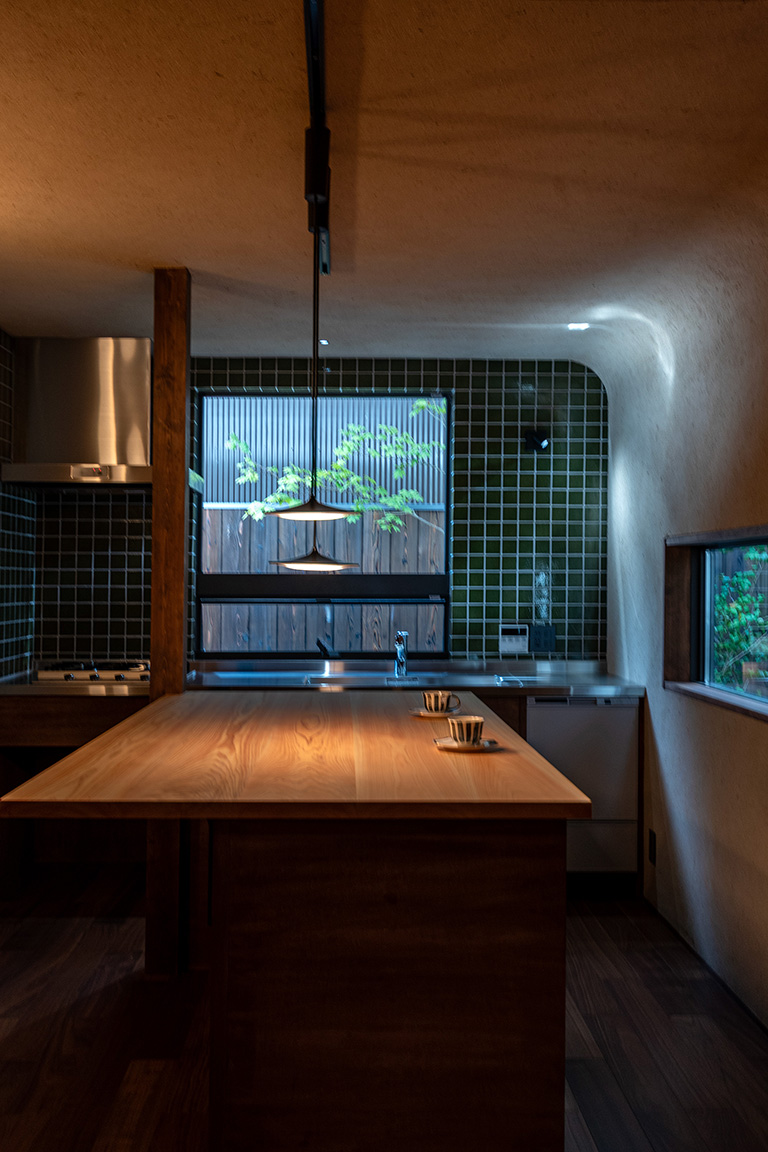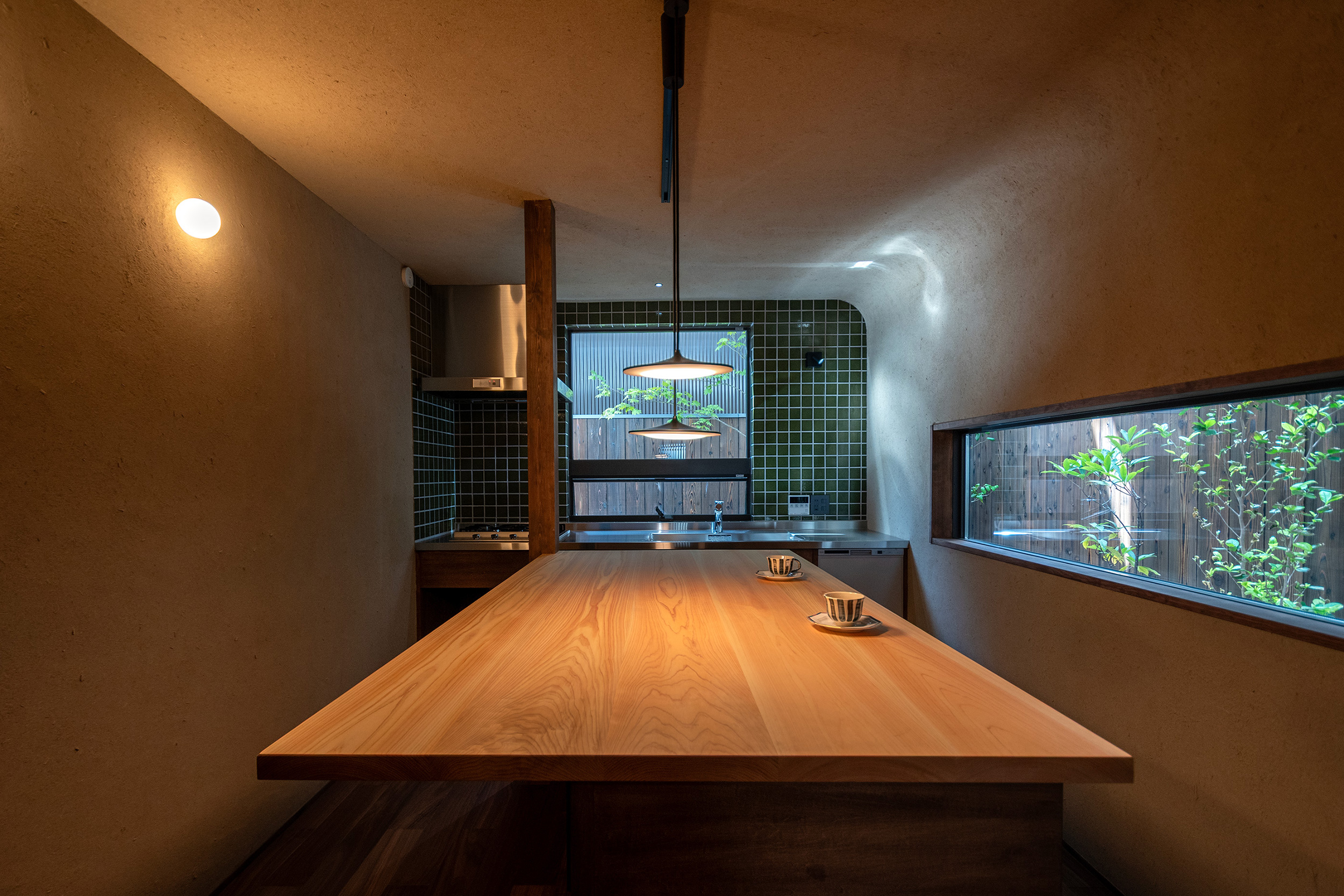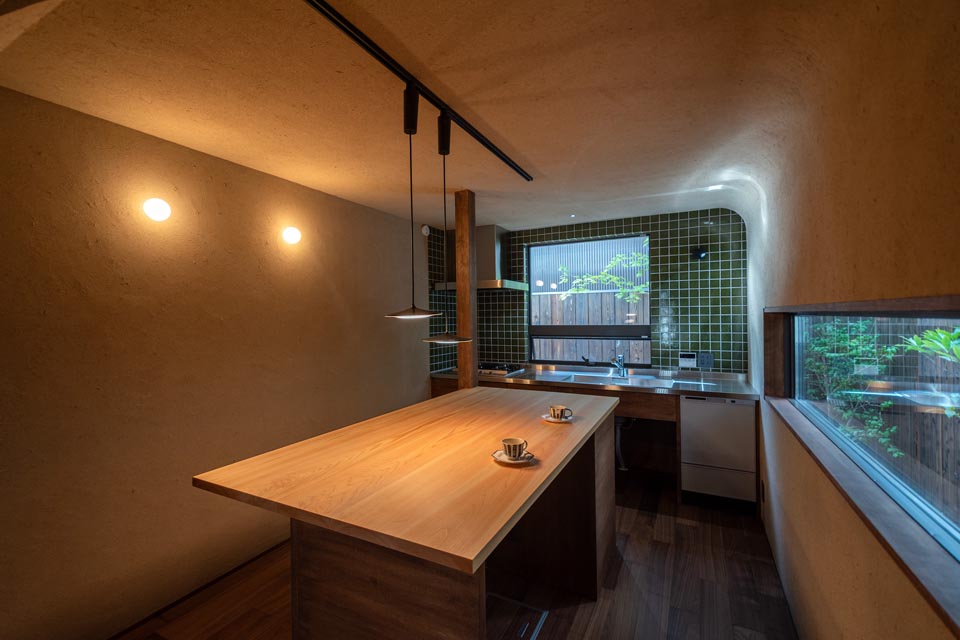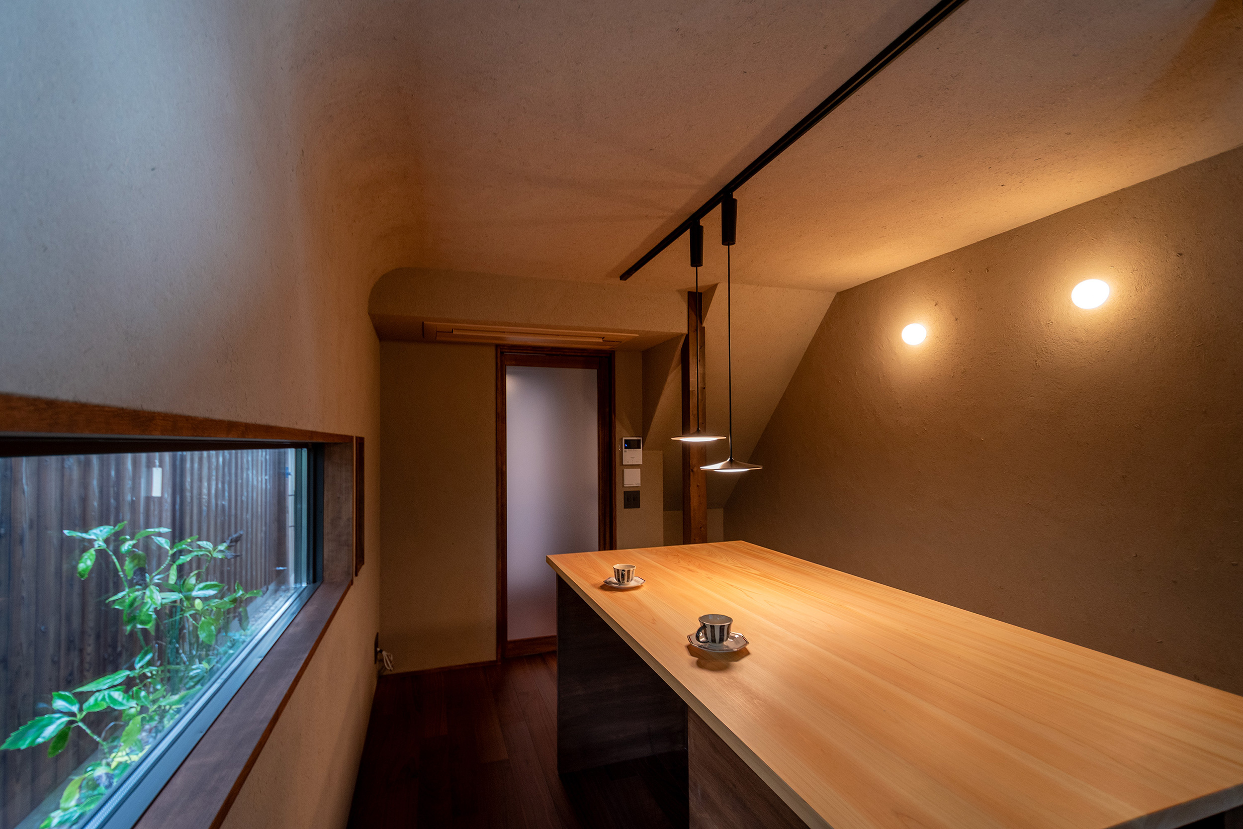 一階のダイニングキッチンは、光と曲線が織りなす美しい空間。南側から差し込む自然光と、天井や壁の間接照明が織りなす光のグラデーションが、静かな洞窟のような落ち着きと幻想的な雰囲気を生み出します。木の質感と陰影が調和し、日常の中に特別なひとときを提供する場です。