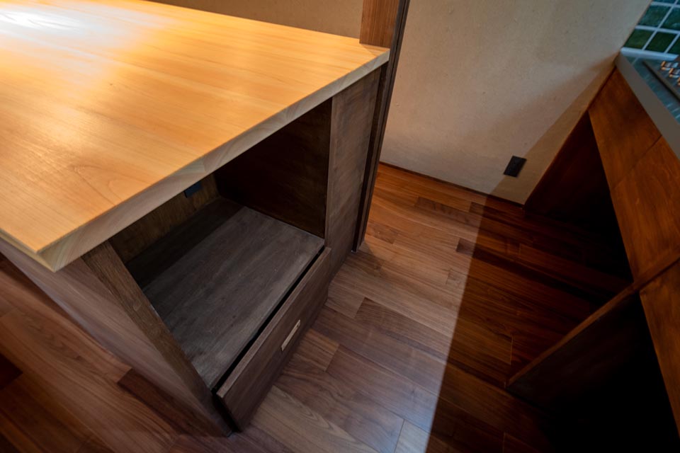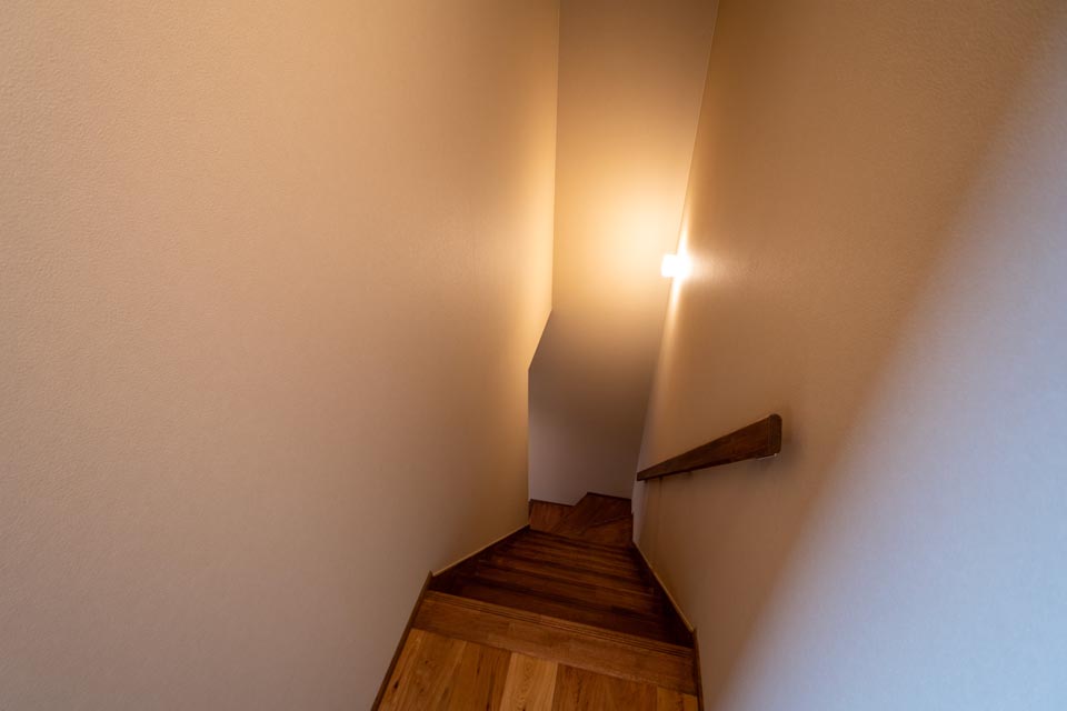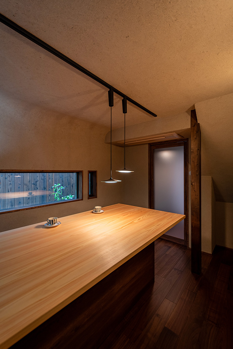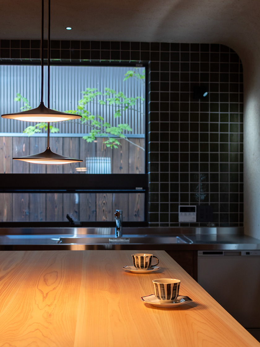 一階のダイニングキッチンは、光と曲線が織りなす美しい空間。南側から差し込む自然光と、天井や壁の間接照明が織りなす光のグラデーションが、静かな洞窟のような落ち着きと幻想的な雰囲気を生み出します。木の質感と陰影が調和し、日常の中に特別なひとときを提供する場です。
