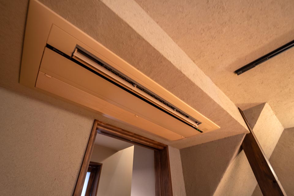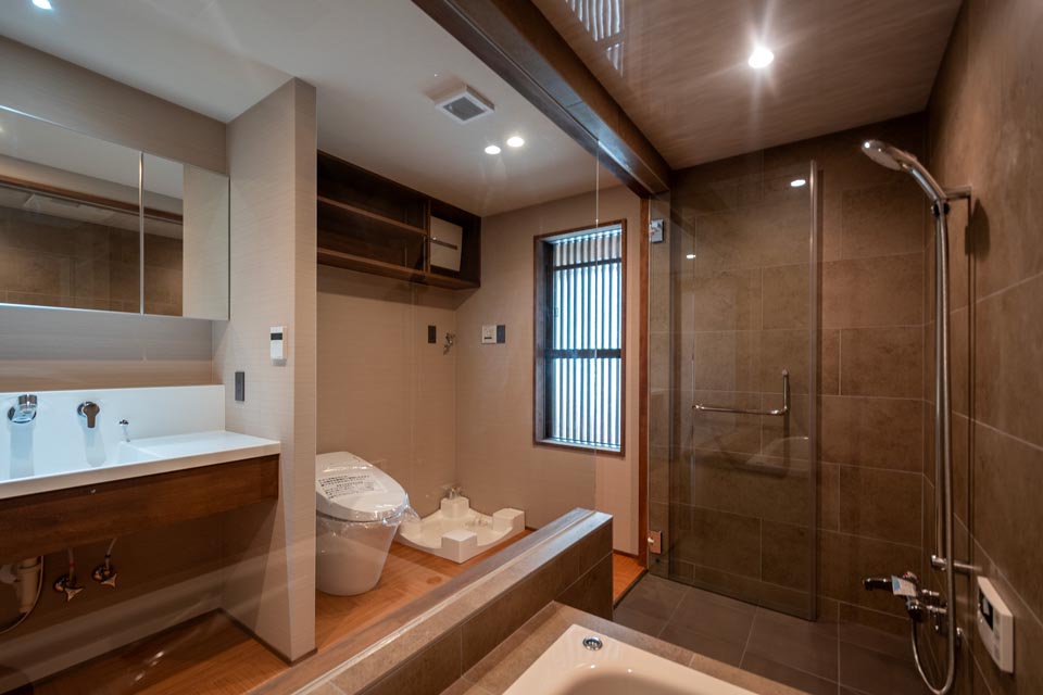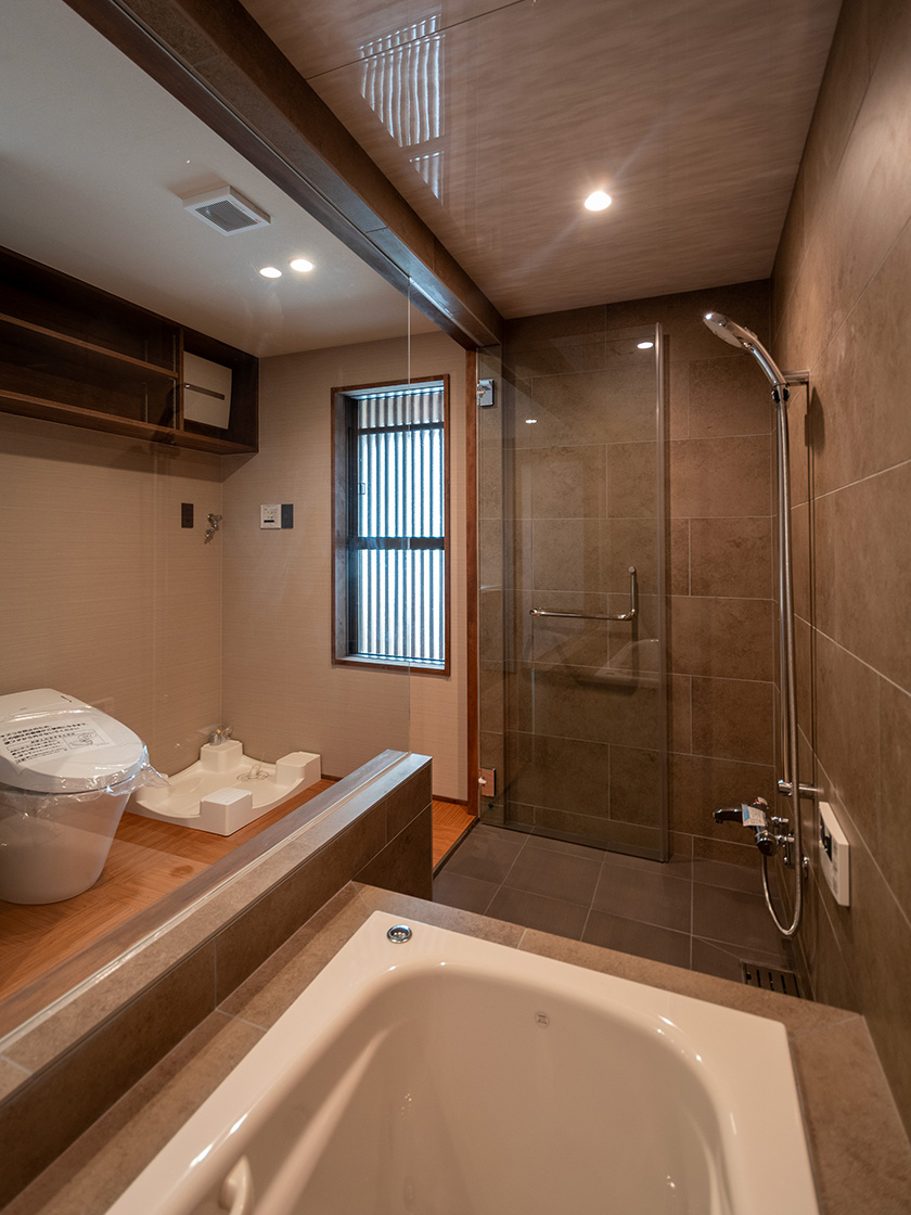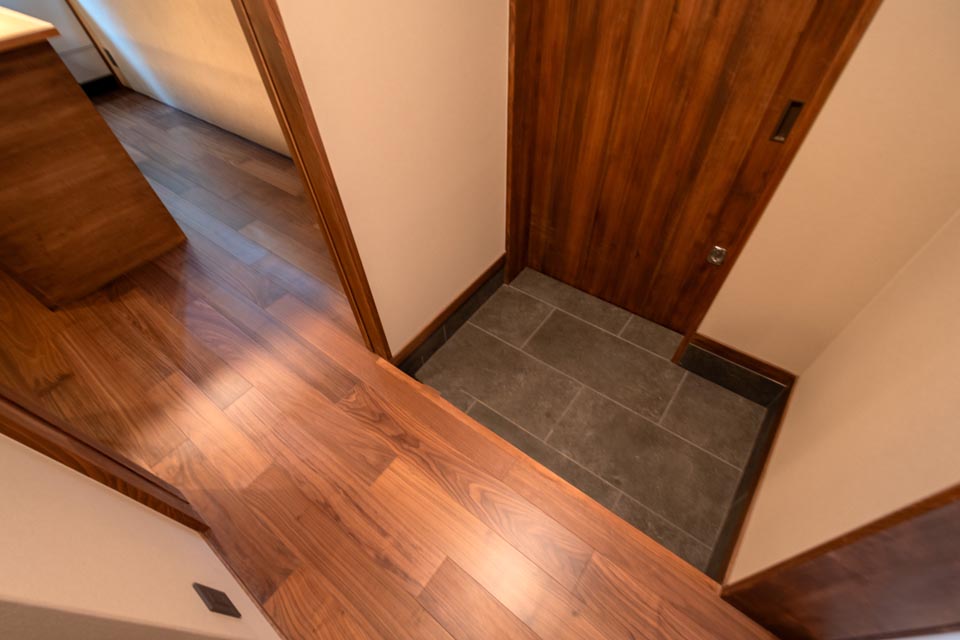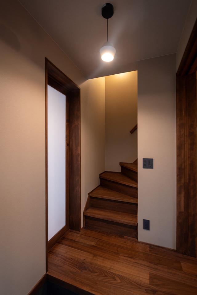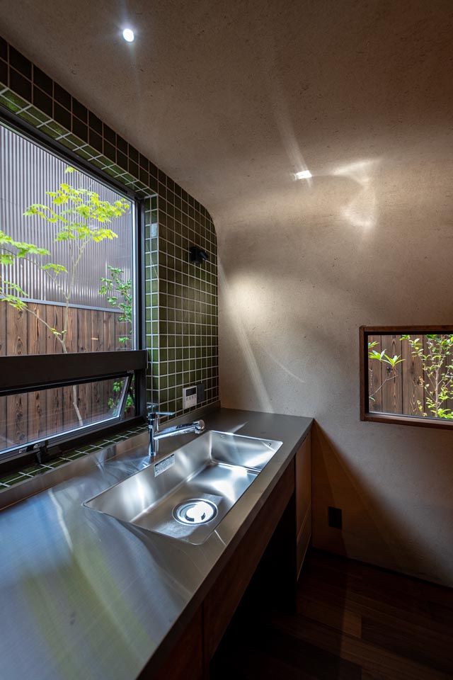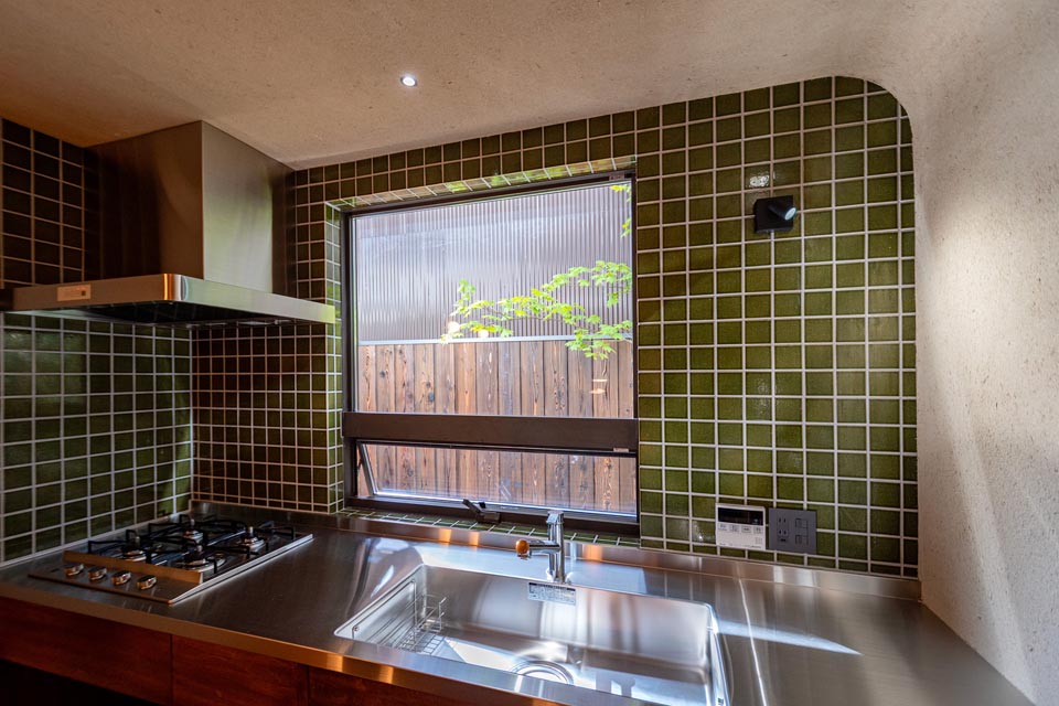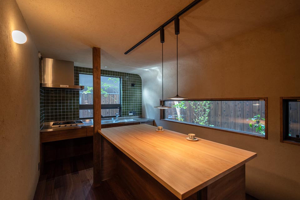 格子戸を開けると、専用庭が玄関まで続き、四季折々の風景を楽しめます。1階には、洞窟のような落ち着いた雰囲気のダイニングキッチンと、水回り(浴室・洗面・トイレ)を集約。