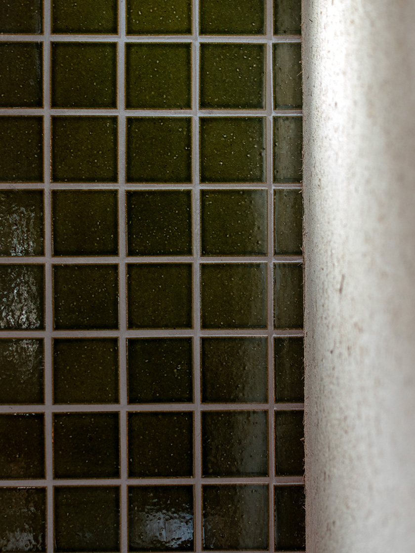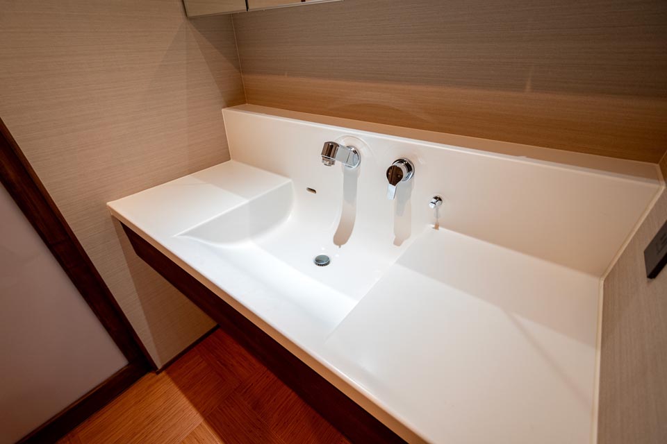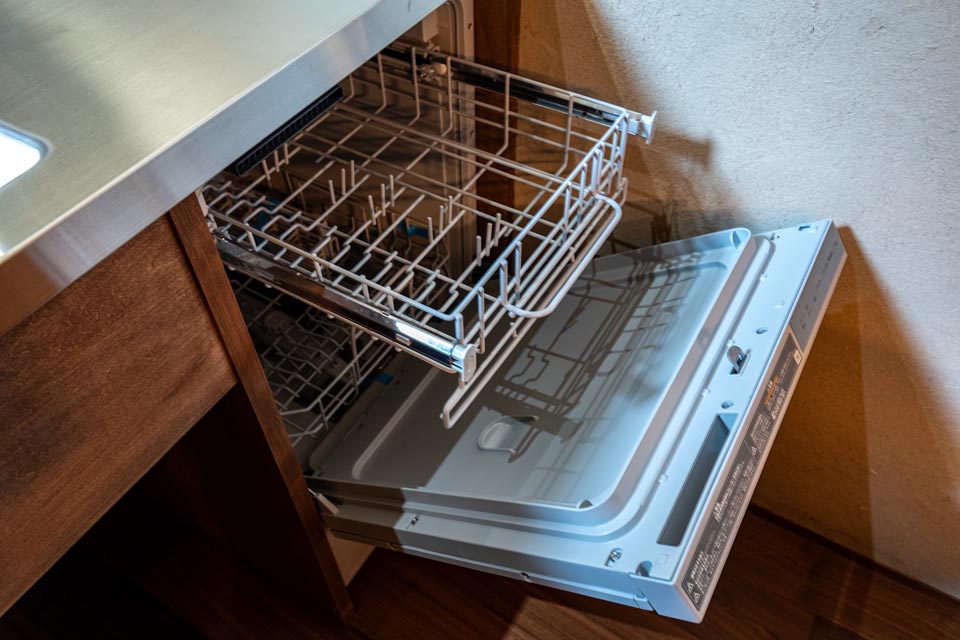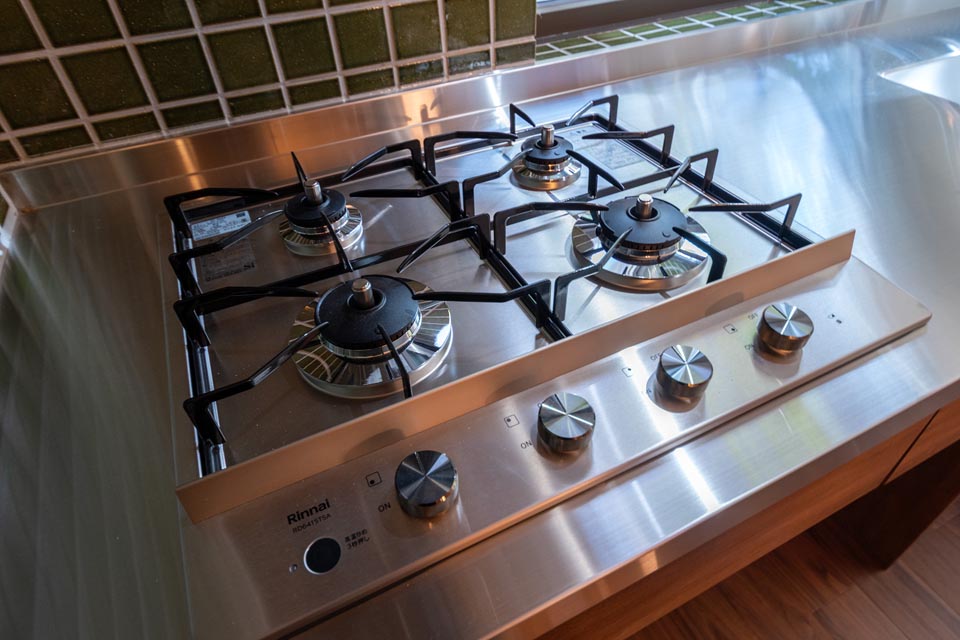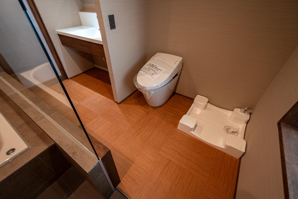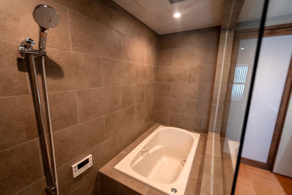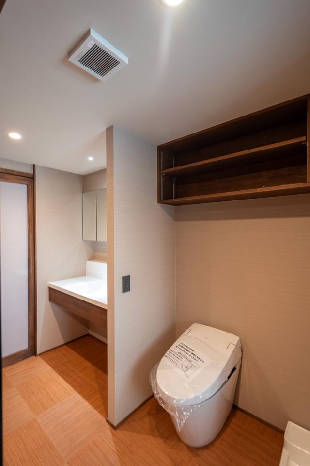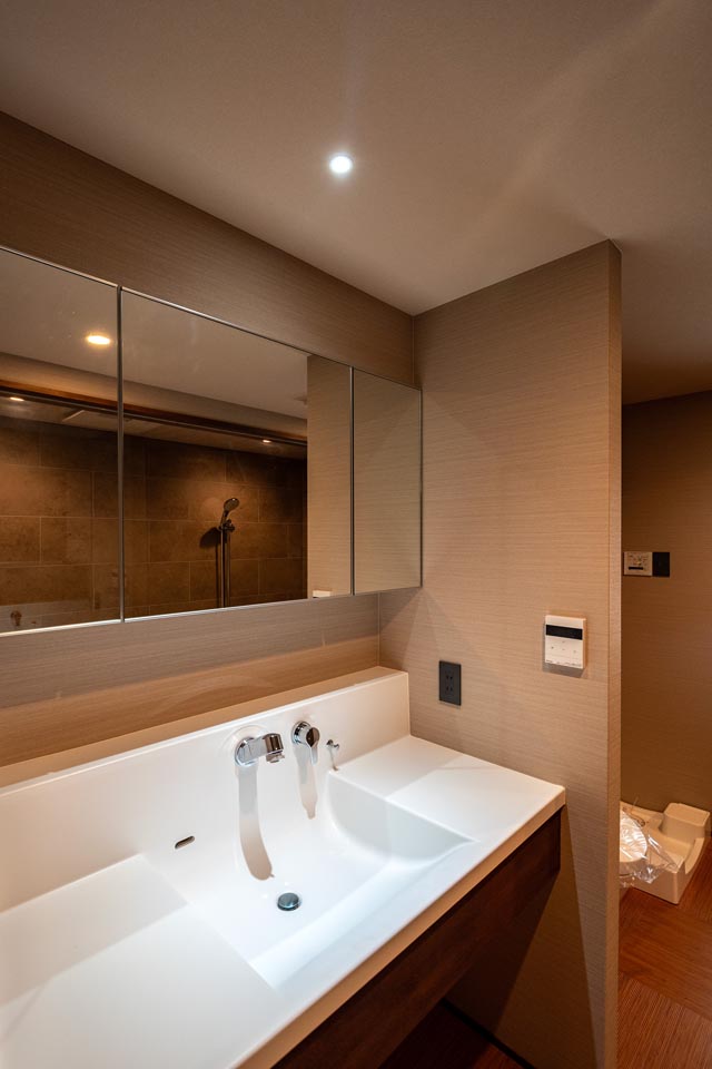 格子戸を開けると、専用庭が玄関まで続き、四季折々の風景を楽しめます。1階には、洞窟のような落ち着いた雰囲気のダイニングキッチンと、水回り(浴室・洗面・トイレ)を集約。