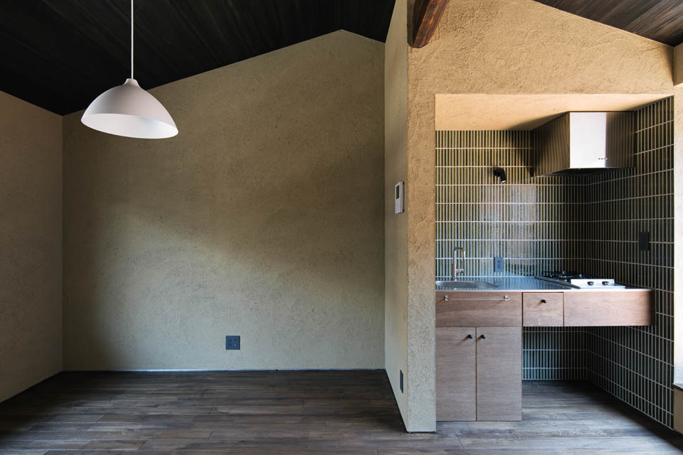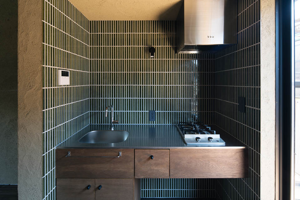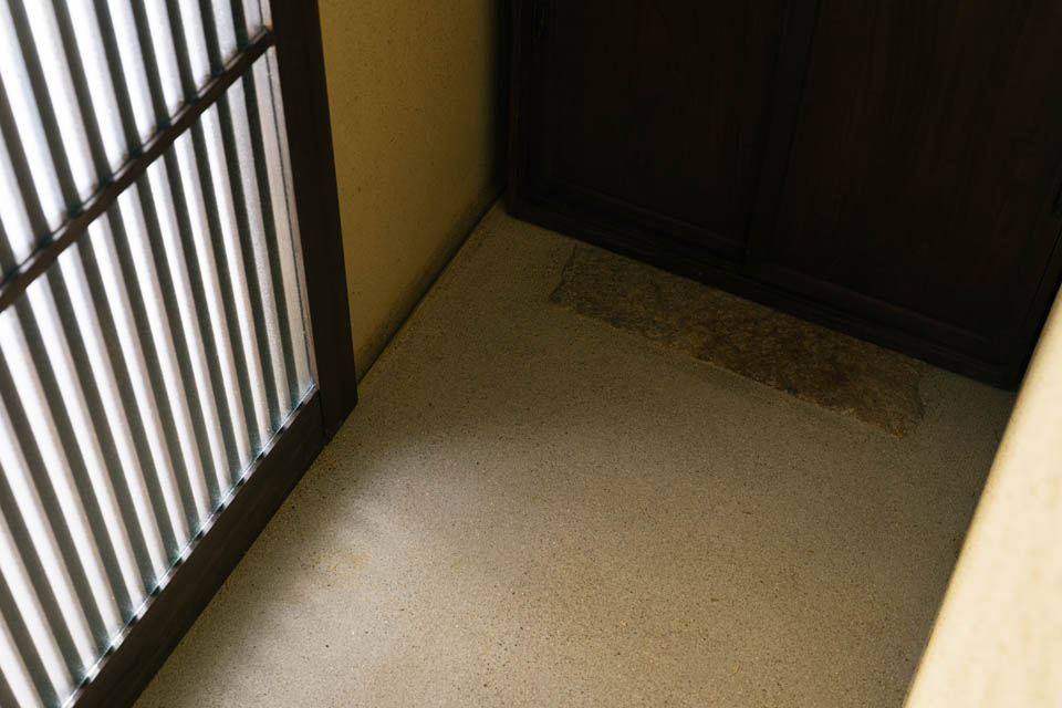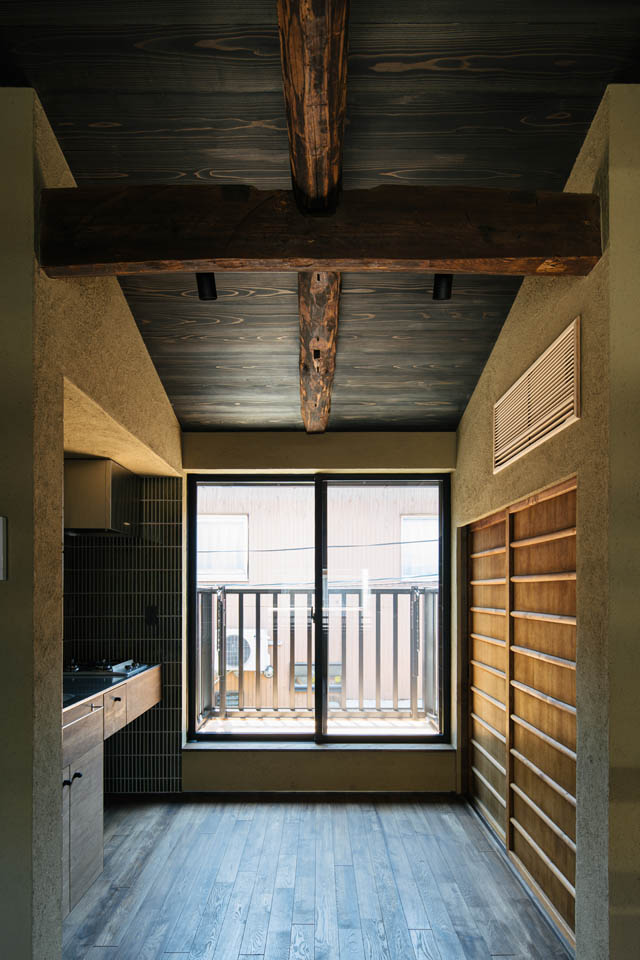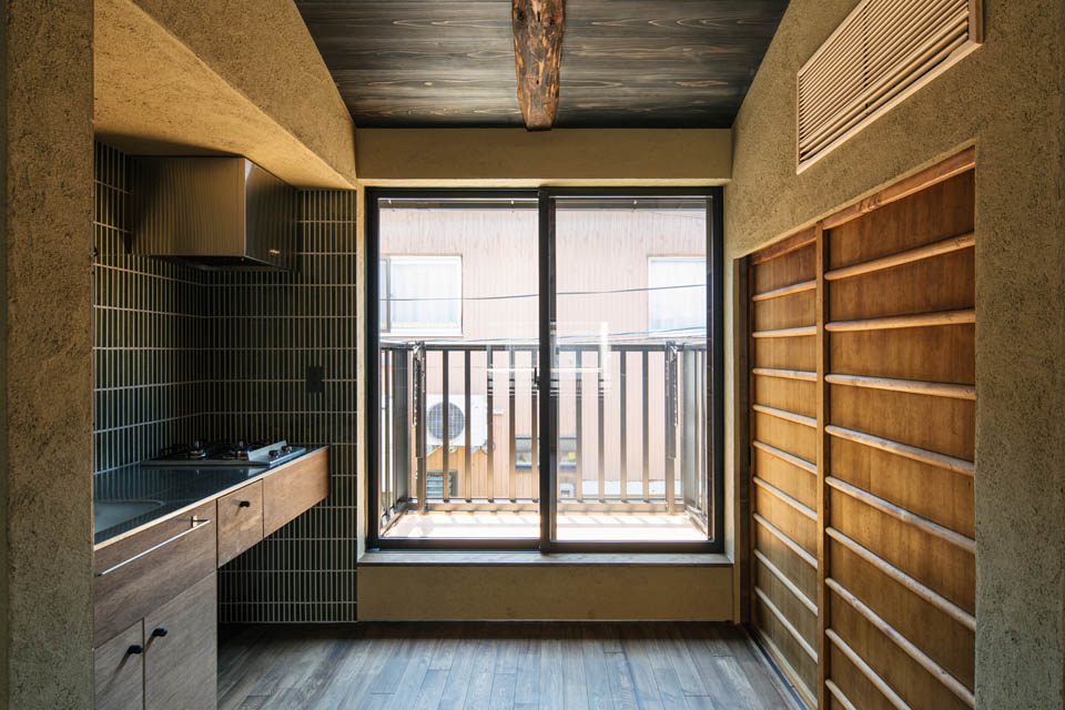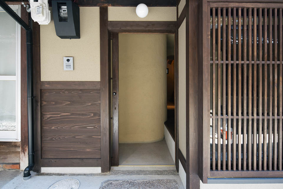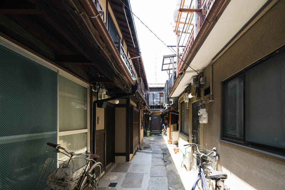 トンネル路地を抜けると、両側に京町家が建ち並び、いかにも“路地”らしい雰囲気が広がります。物件へと向かう道のりは、まるで中へ“こもっていく”ような感覚。そんな立地にふさわしく、住まいもまた、最低限の生活空間でありながら、落ち着きと心地よさを感じられるよう設計しました。