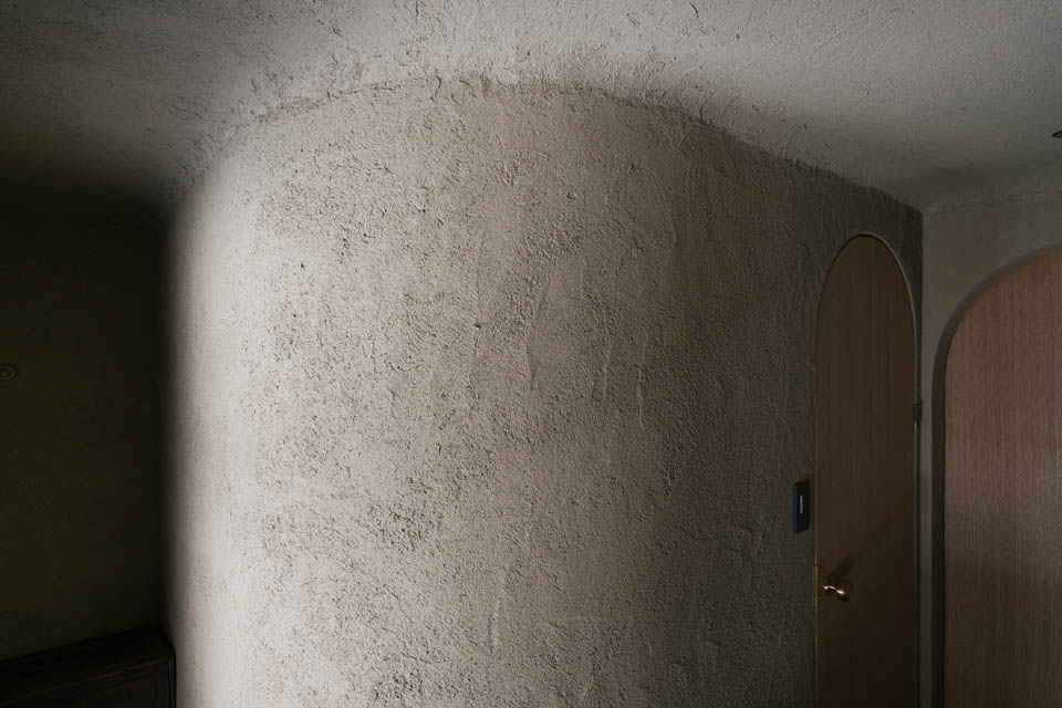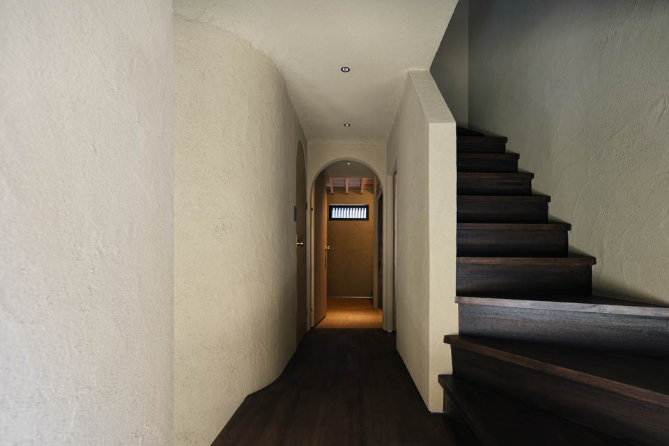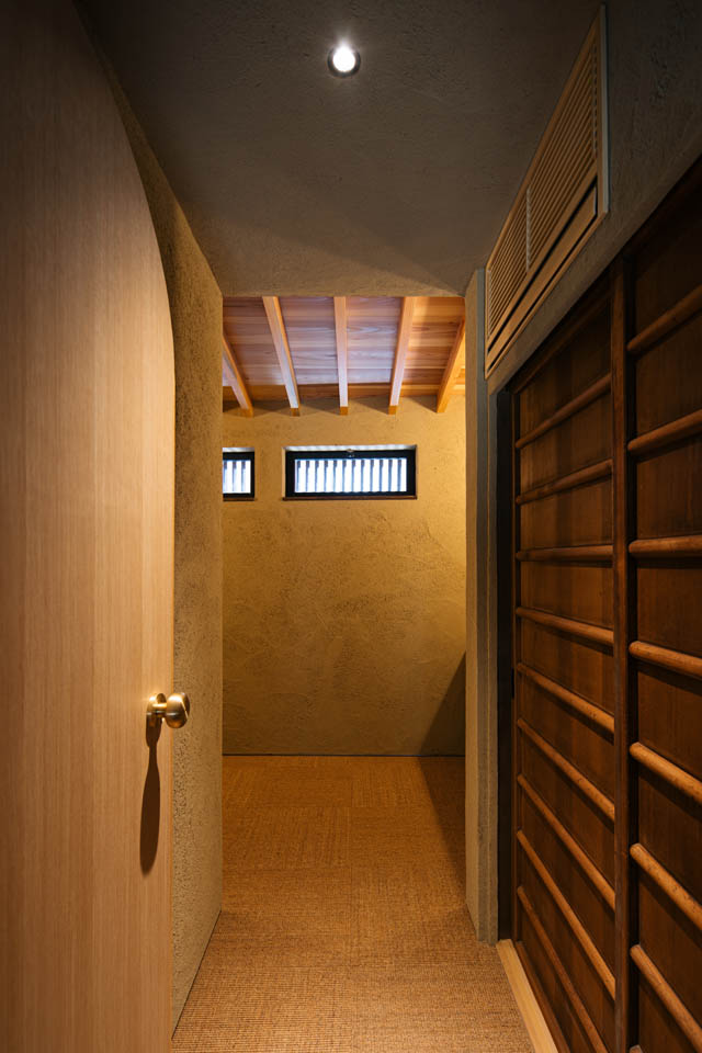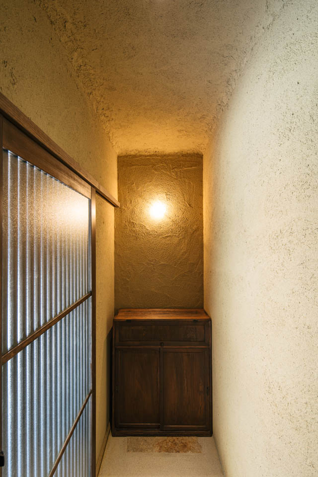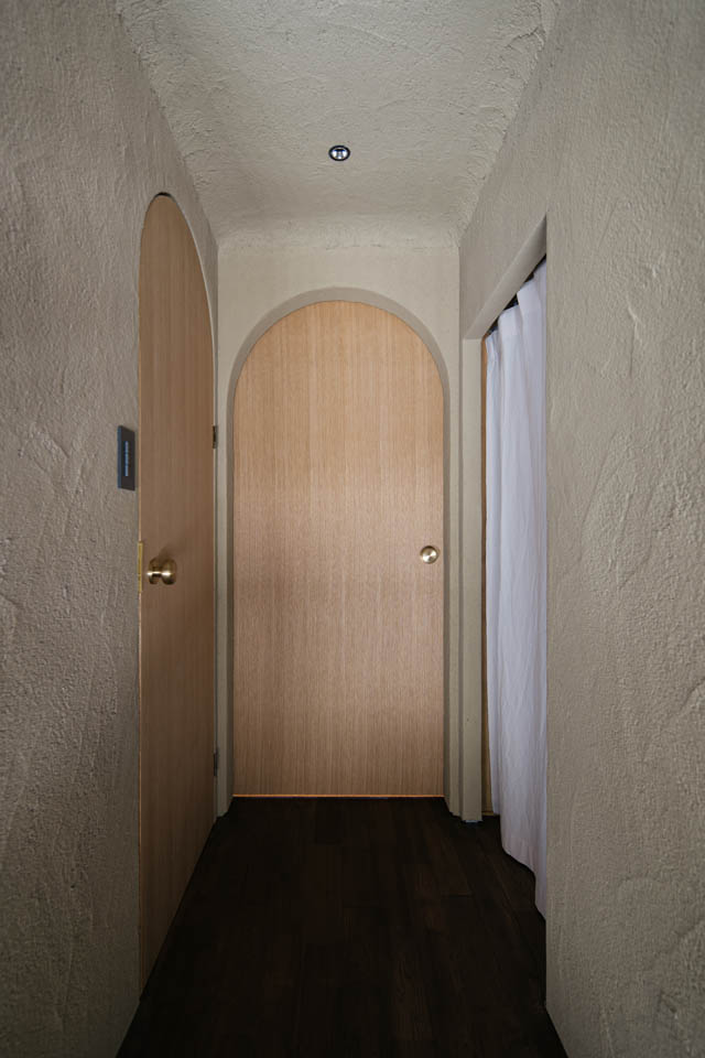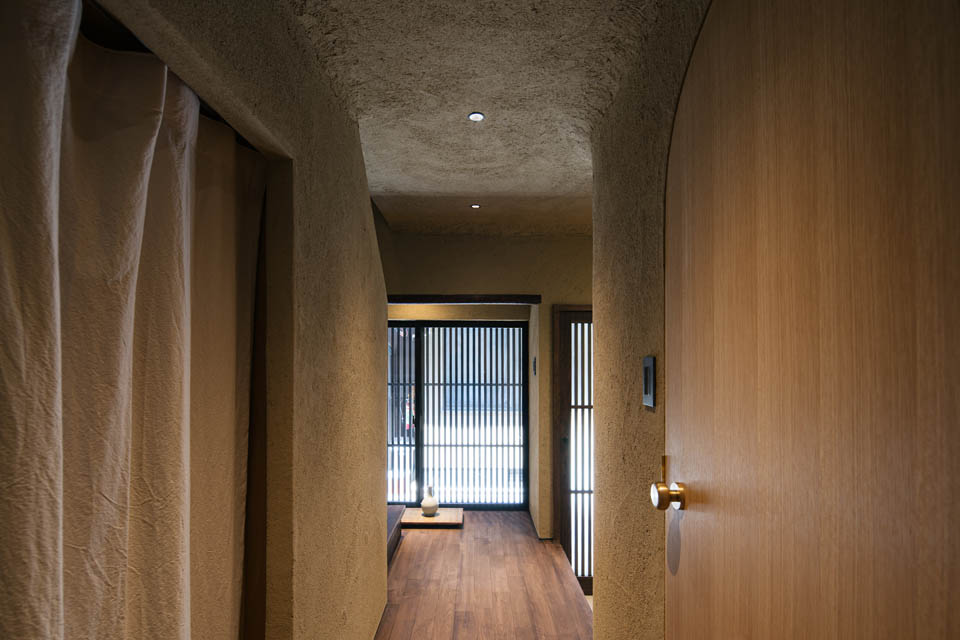 玄関から廊下にかけては、壁・天井ともに土壁の仕上げとし、自然素材の持つ柔らかさを感じられるように。洗面と廊下の建具には頂部にアール(曲線)を施し、まるで洞窟の中にいるような、包み込まれる設えにしました。
