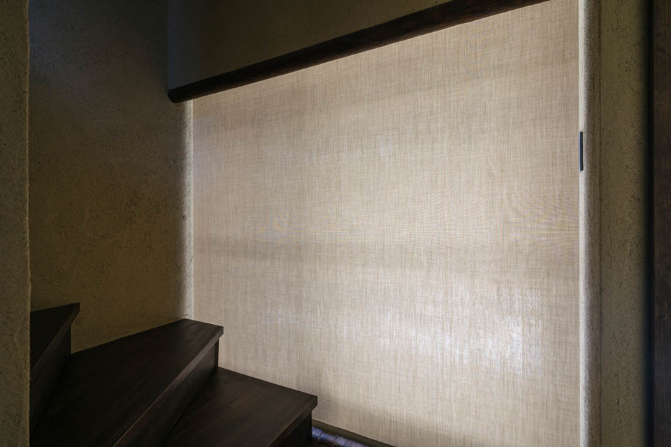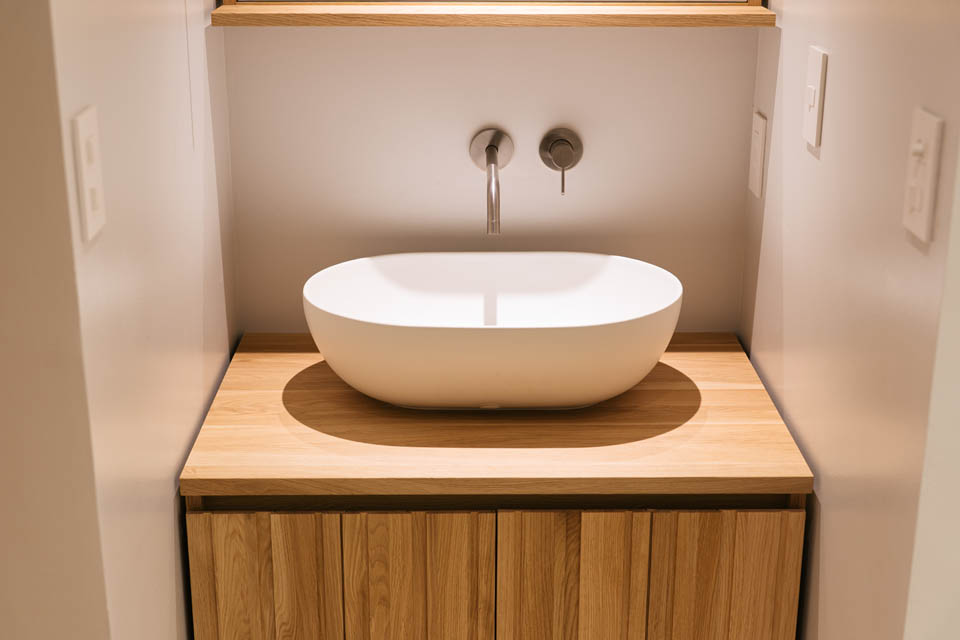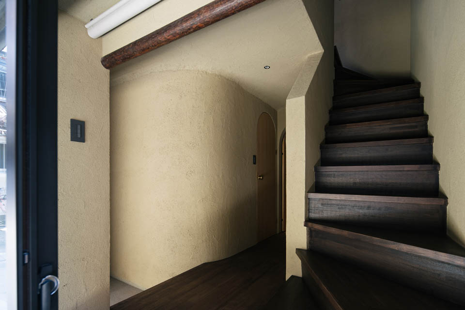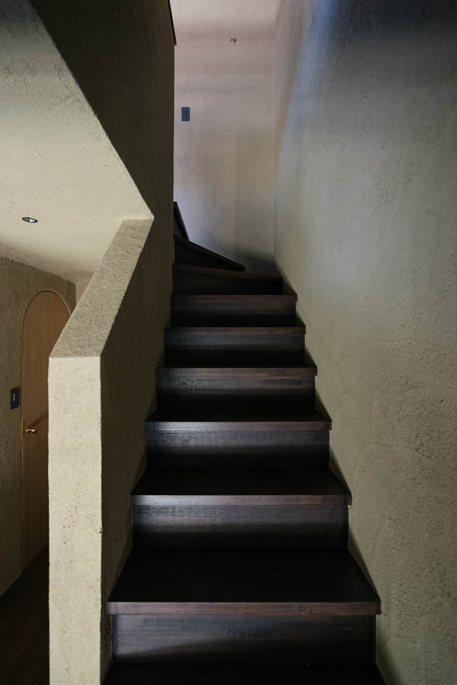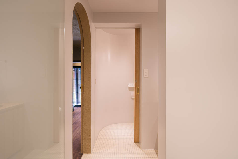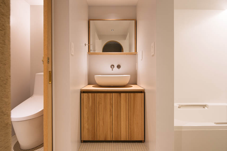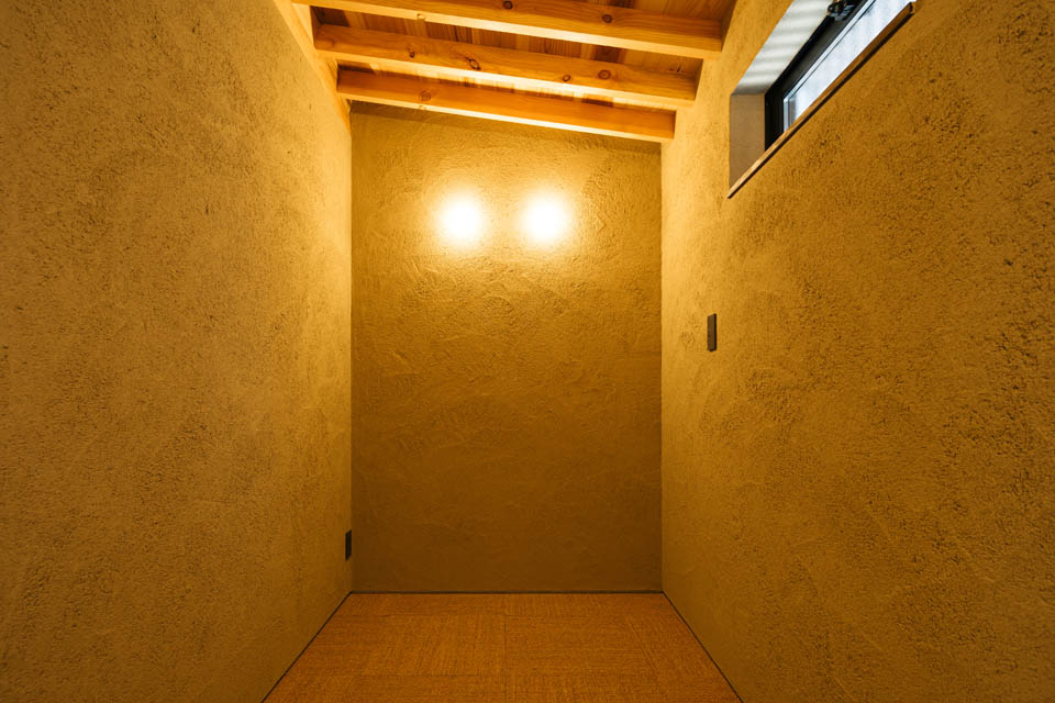 玄関から廊下にかけては、壁・天井ともに土壁の仕上げとし、自然素材の持つ柔らかさを感じられるように。洗面と廊下の建具には頂部にアール(曲線)を施し、まるで洞窟の中にいるような、包み込まれる設えにしました。