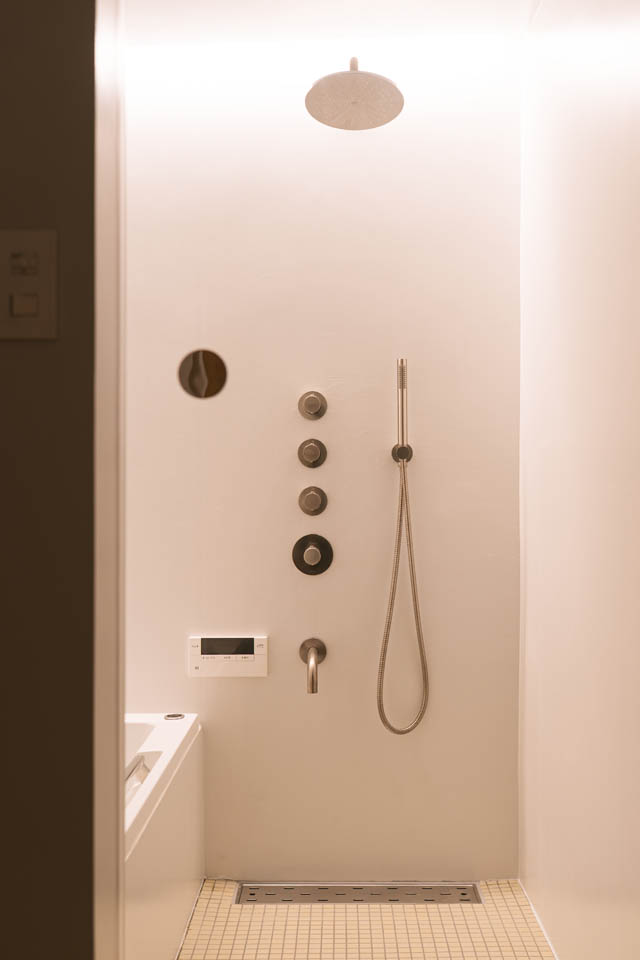 洗面スペースと一体となった浴室は、間接照明が柔らかく空間を包み込み、穏やかな雰囲気が広がります。調光機能も備えているため、リラックスタイムには灯りを落として、心地よいひとときを過ごすことができます。