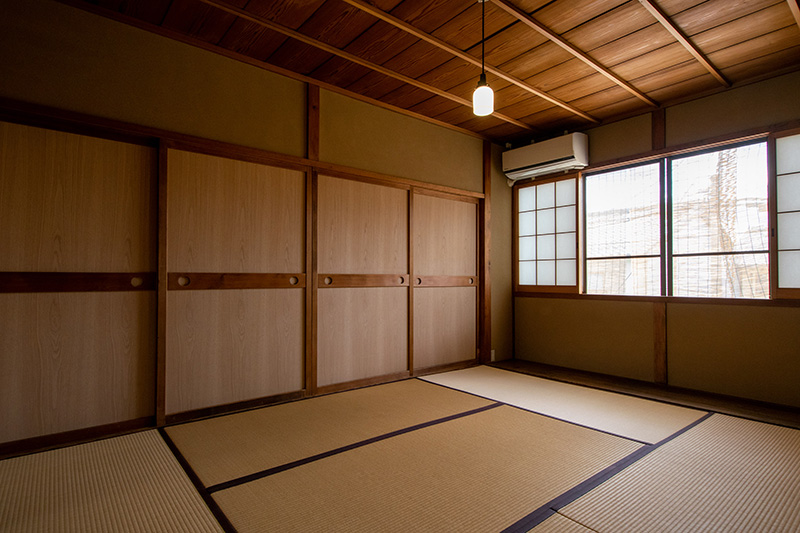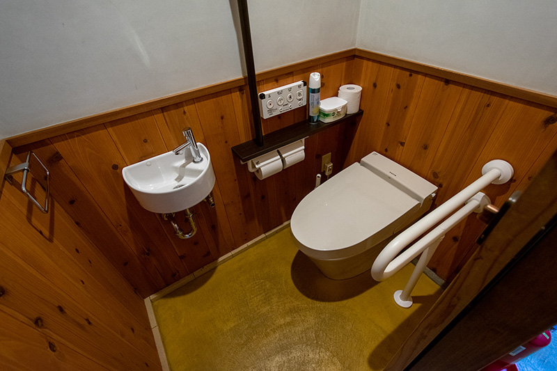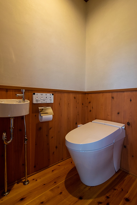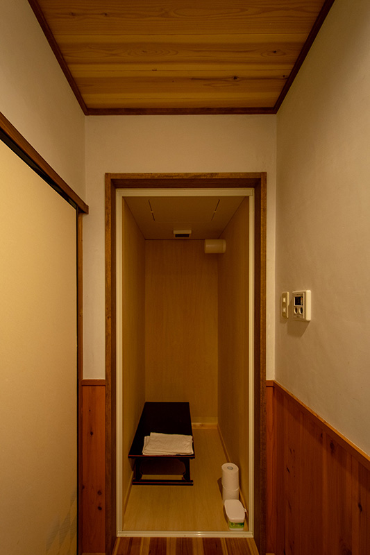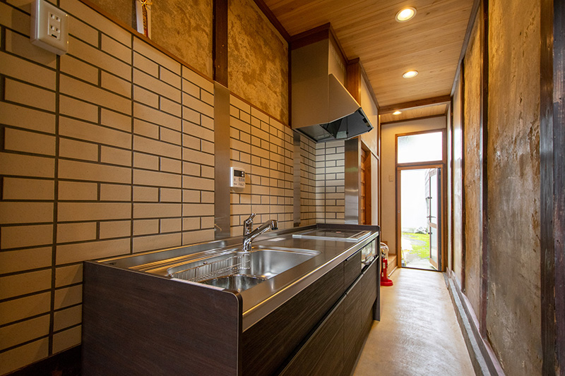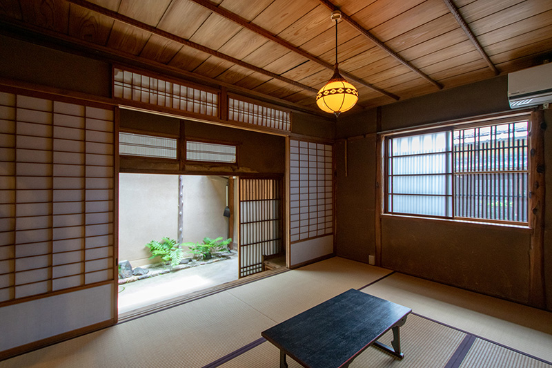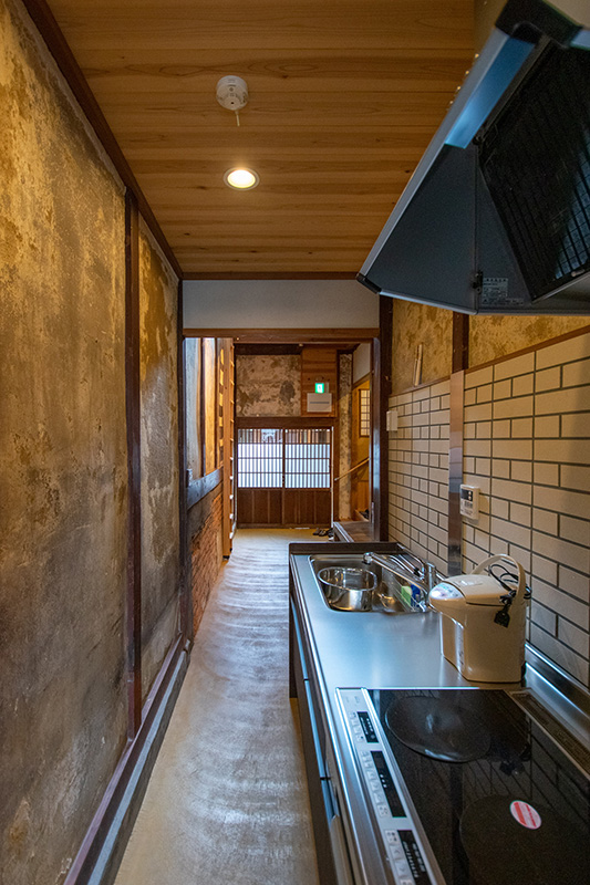 扉を入るとまず玄関庭が出迎えます。来客をもてなす広々とした玄関の間、通り庭や吹抜(火袋)が残るなど、もとの家の間取をあまり変更せずに手が加えられています。建物入口には車いすを押せるスロープが付き、水廻りは現代の生活に合わせてやり替え済、2階にもトイレが付くなど、趣が感じられながらも、利便性にも配慮された改修がされています。