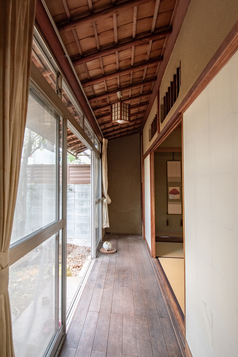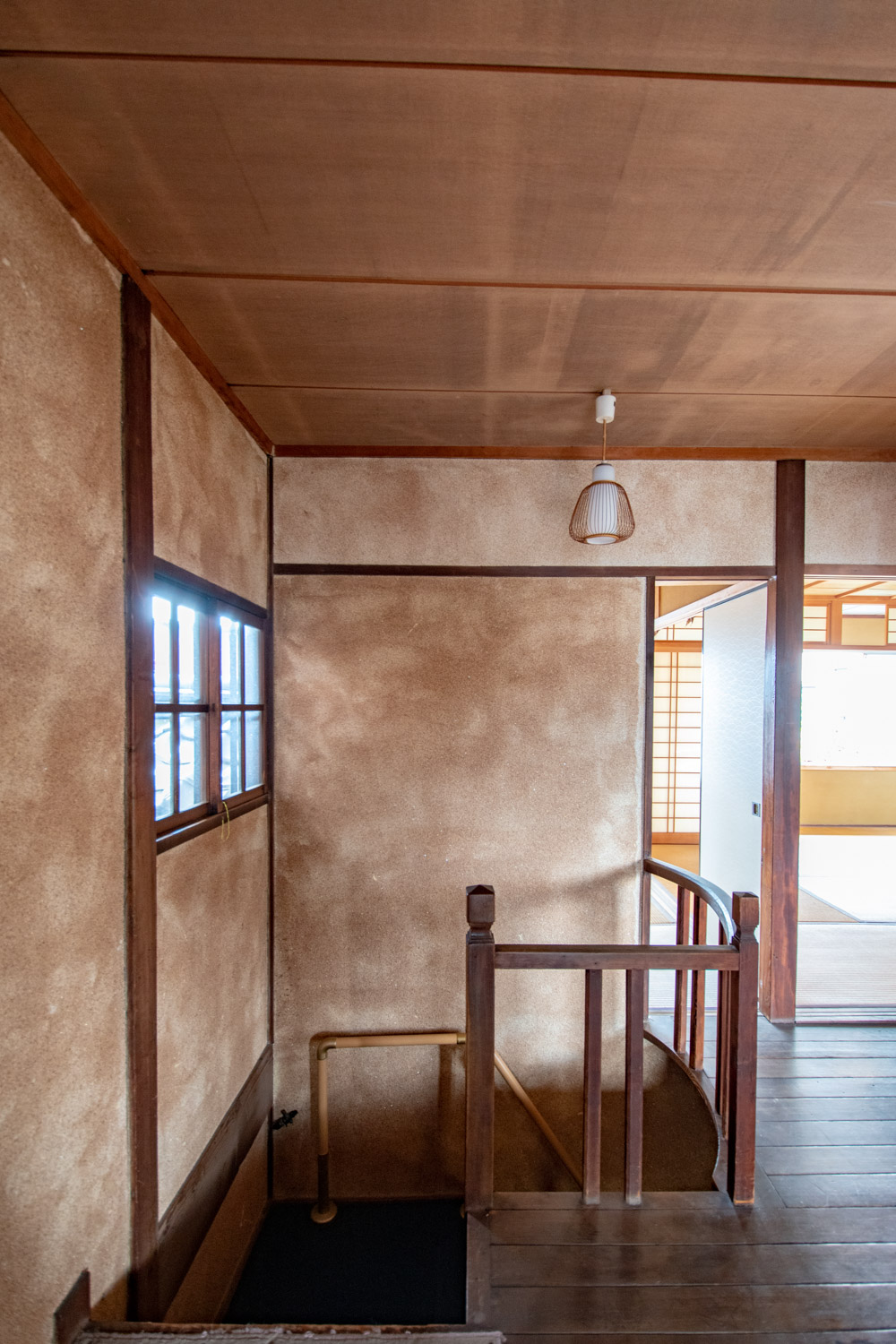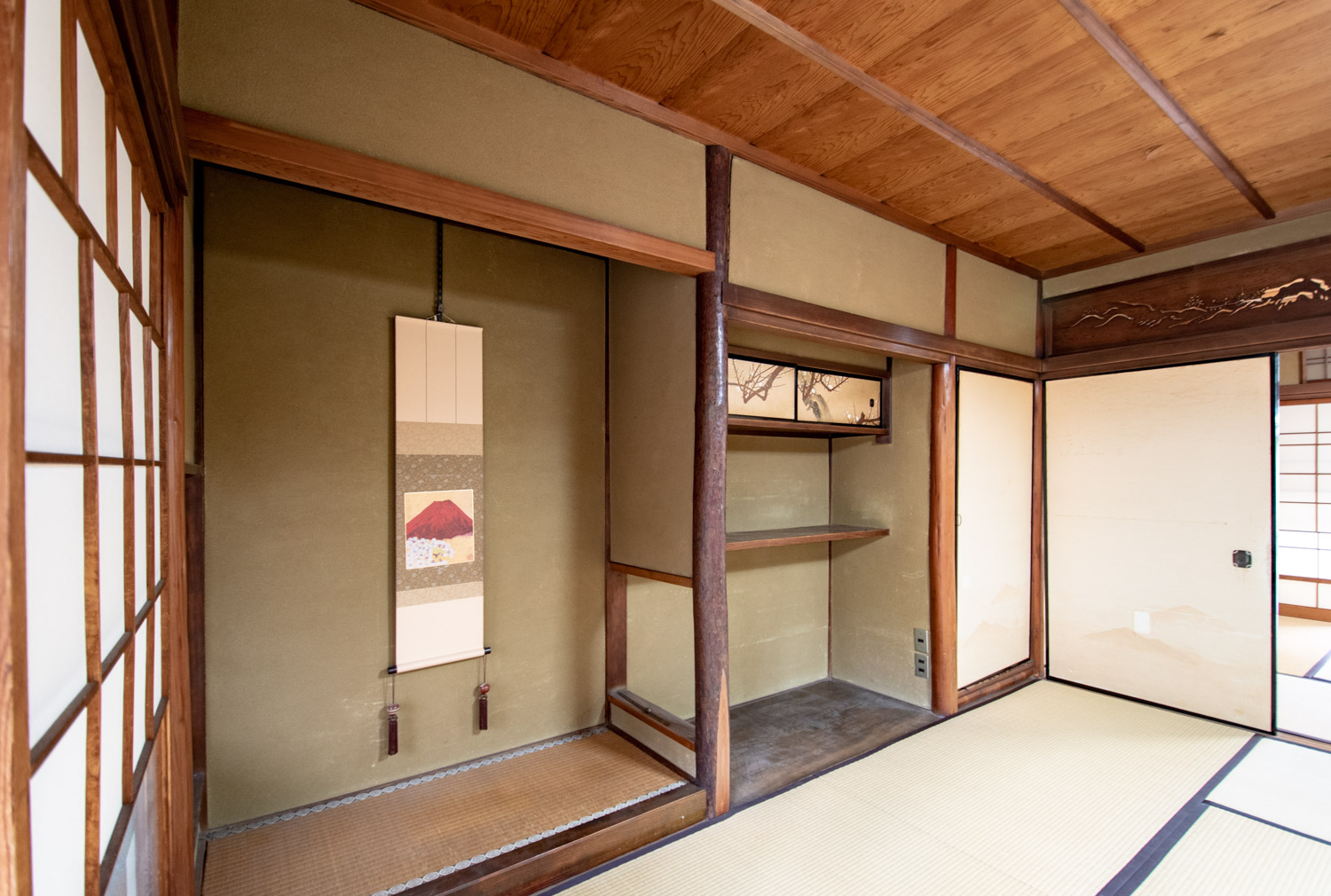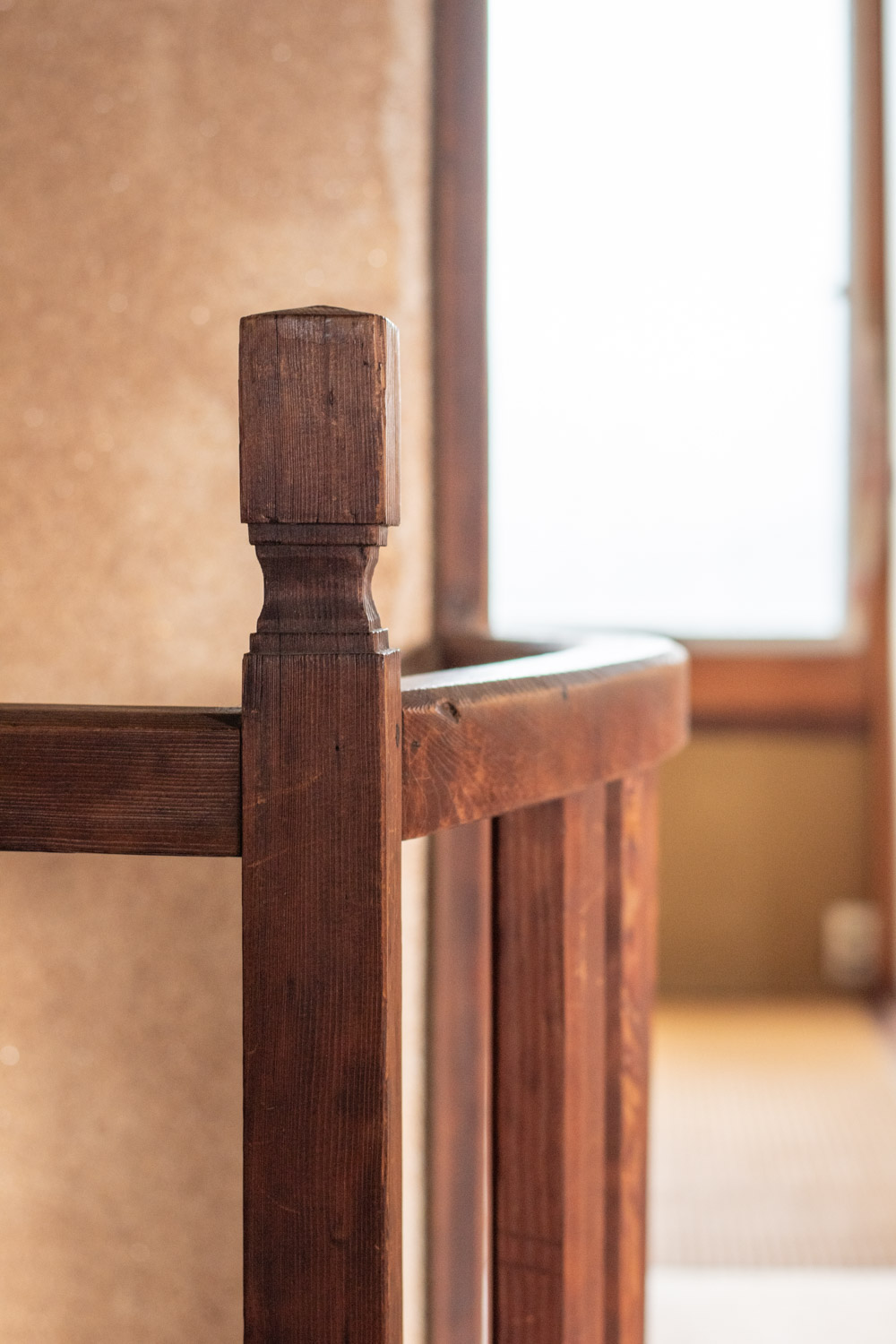 表構えの杉板の塀と冠木門(かぶきもん)をはじめ、室内では木目調の階段、板天井、透かし彫りの欄間など古い質感の味わい深い意匠を凝らした造りが随所に見受けられます。