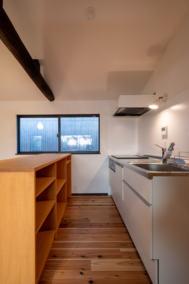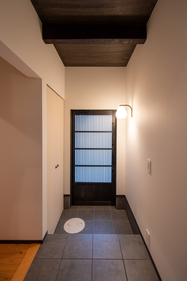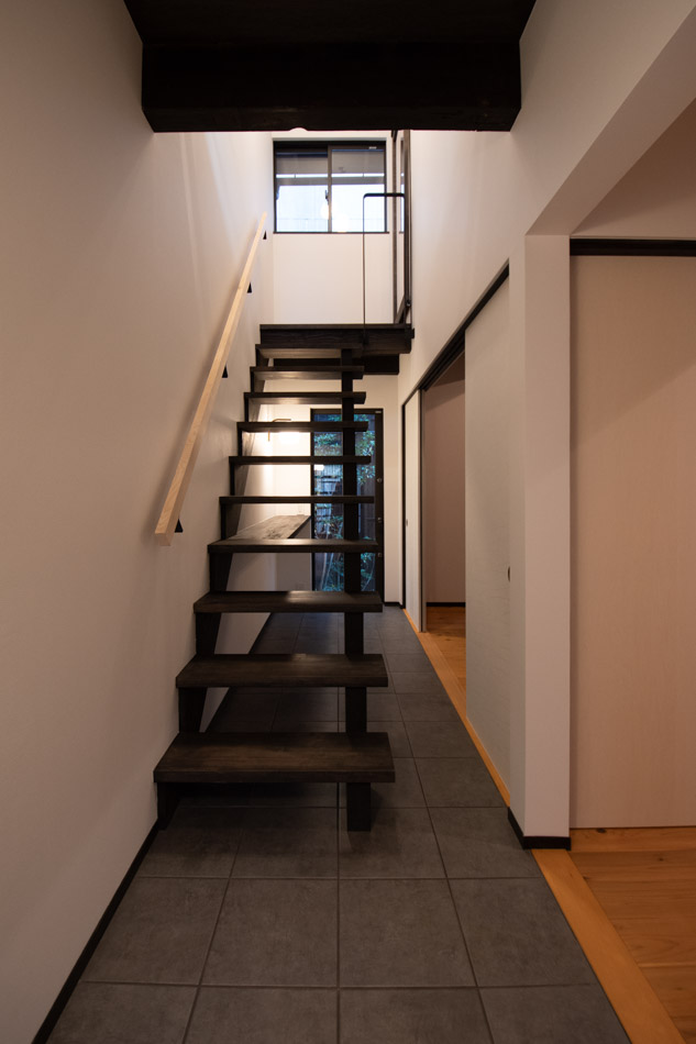 かつてのトオリニワを吹き抜け階段として再構成し、足元には土間の質感を残した床を採用。1階の土間には庭へとつながるガラス扉を設け、奥まで光が届く“抜け感”のある空間に。屋内と庭がゆるやかにつながり、通り庭の名残が息づく、心地よいひろがりが生まれました。