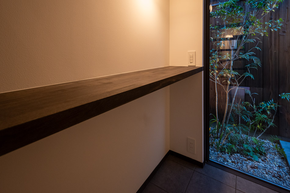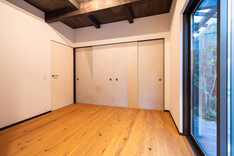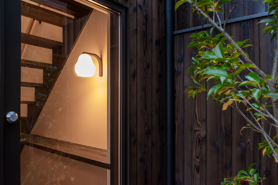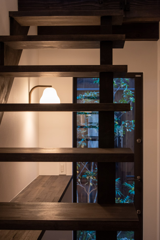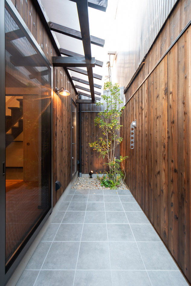 まず1階は、路地奥で元々光が入りにくい環境をいかし、その“暗さ”を落ち着きとして捉えた静かな寝室に。クローゼットと洗濯スペースを隣り合わせに配置し、“洗う → 干す → しまう”の動線が短く、スムーズに行えるよう工夫しています。さらに、庭には吹き抜け階段と同じ質感の舗装を施し、屋内と庭がゆるやかにつながる一体感のある雰囲気を生み出しました。植栽の緑がガラス越しに視界へ入り、室内にいても季節の彩りを楽しめます。