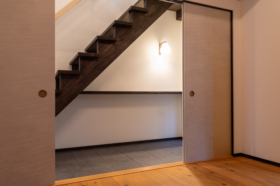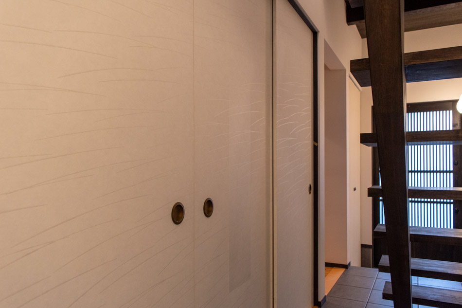 襖は、空間を分けたり一つにつなげたりと、日本の暮らしに寄り添ってきた伝統建具です。その中でも“唐紙襖”は、版木による手摺りや文様の表現など、伝統技法を用いて仕上げられる特別なもの。紙そのものに意匠が宿り、住まいに静かな華と上質さを添えます。本物件では、1階と2階に異なる図案の唐紙襖を設え、空間や時間の移ろいを愉しめるしつらえとしました。