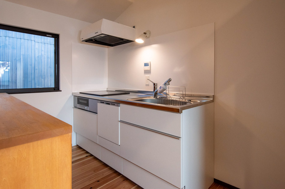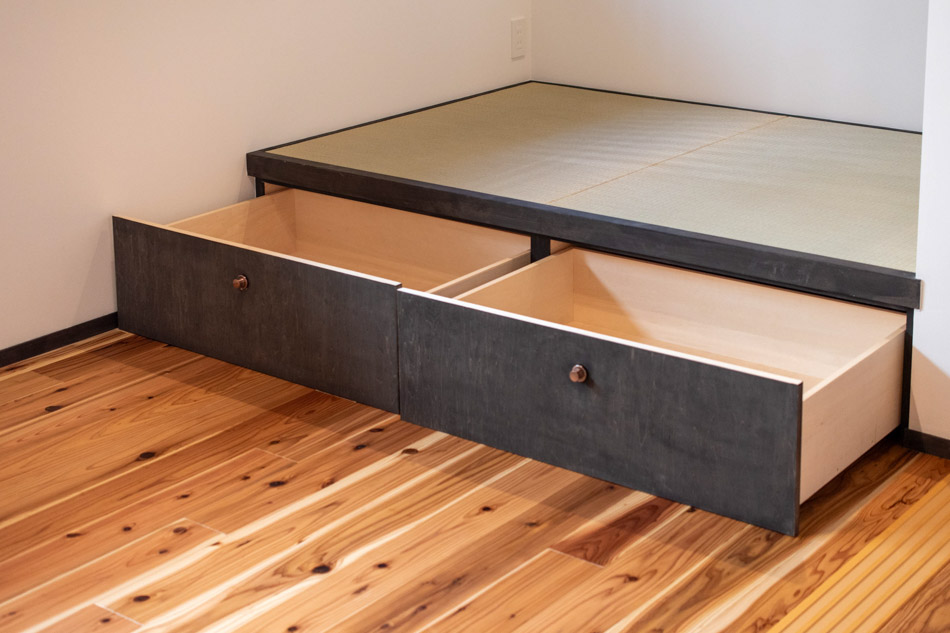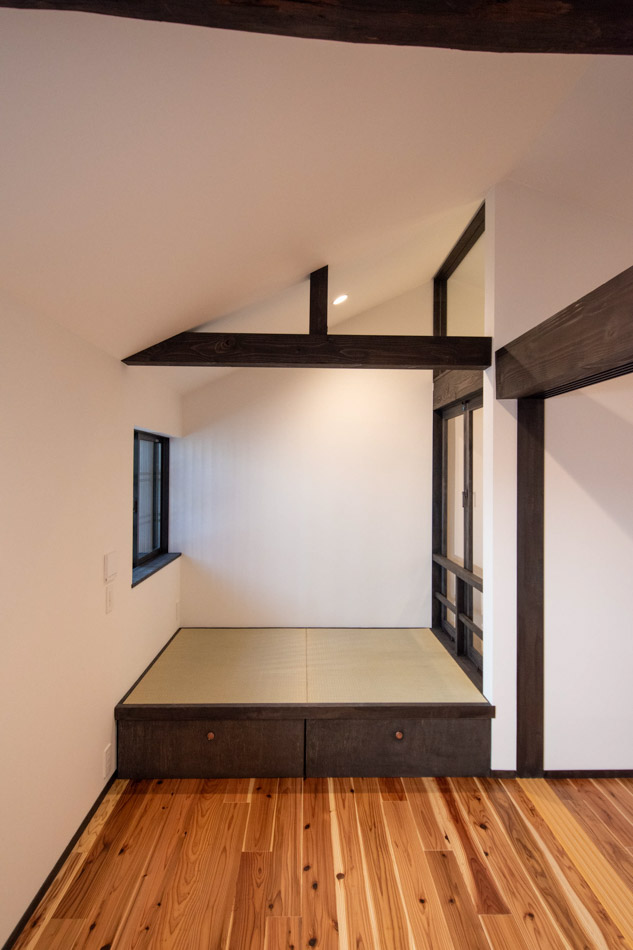 階段を上がった2階には、日当たりのよい場所を活かしたLDKを配置。家族や友人が自然と集まる、明るく開放的な団らんの場となっています。加えて、二畳ほどの小さな畳スペースをしつらえ、昼寝や読書、語らいにもぴったりの“特等席”に。ここにもガラス扉を組み合わせ、奥まった位置でも明るさを取り込める、ひと続きの心地よい空間が広がります。