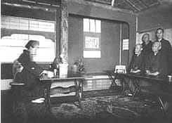茶道を愛した茂次郎氏が吉田山の東側一帯を購入し「茂庵庭園」をつくります。現存する茶室は静閑亭と田舎席の2棟ですが最盛期には8棟の茶室と月見台・楼閣もあったそうです。待合も数棟が、現在も残っています。当時は大規模な茶会が開かれたようで、その様子の写真もあります。