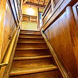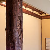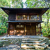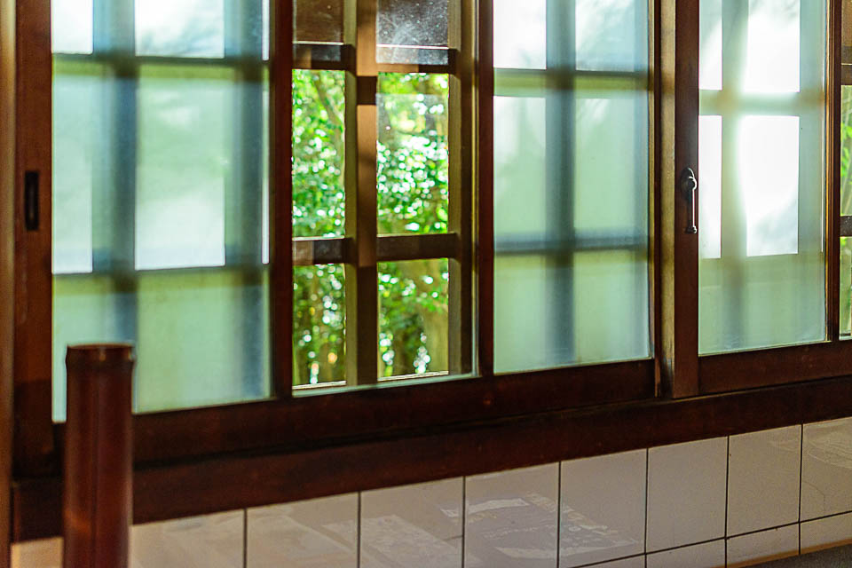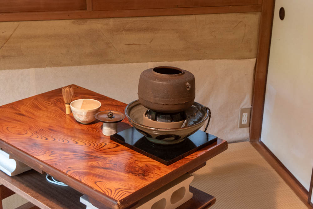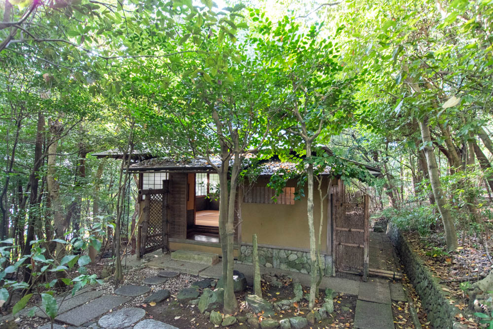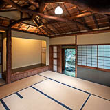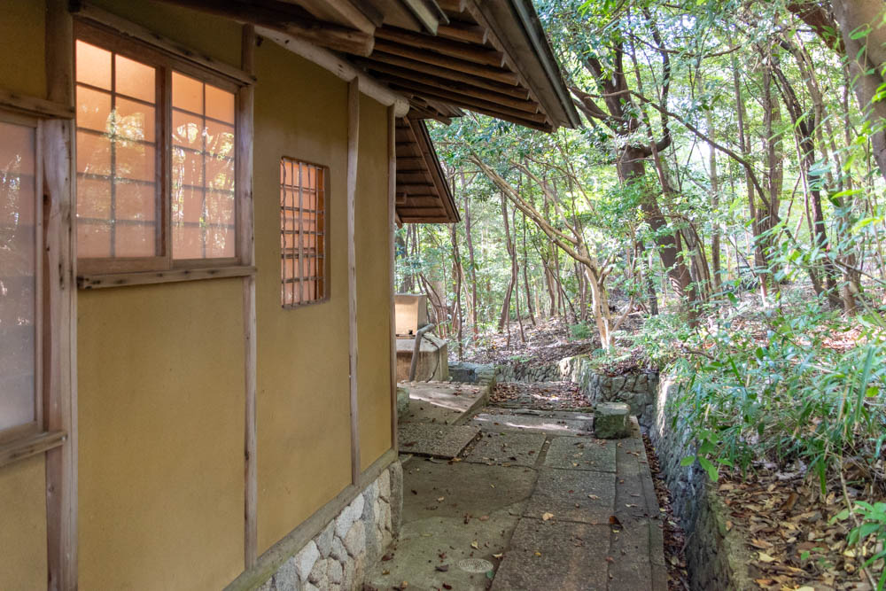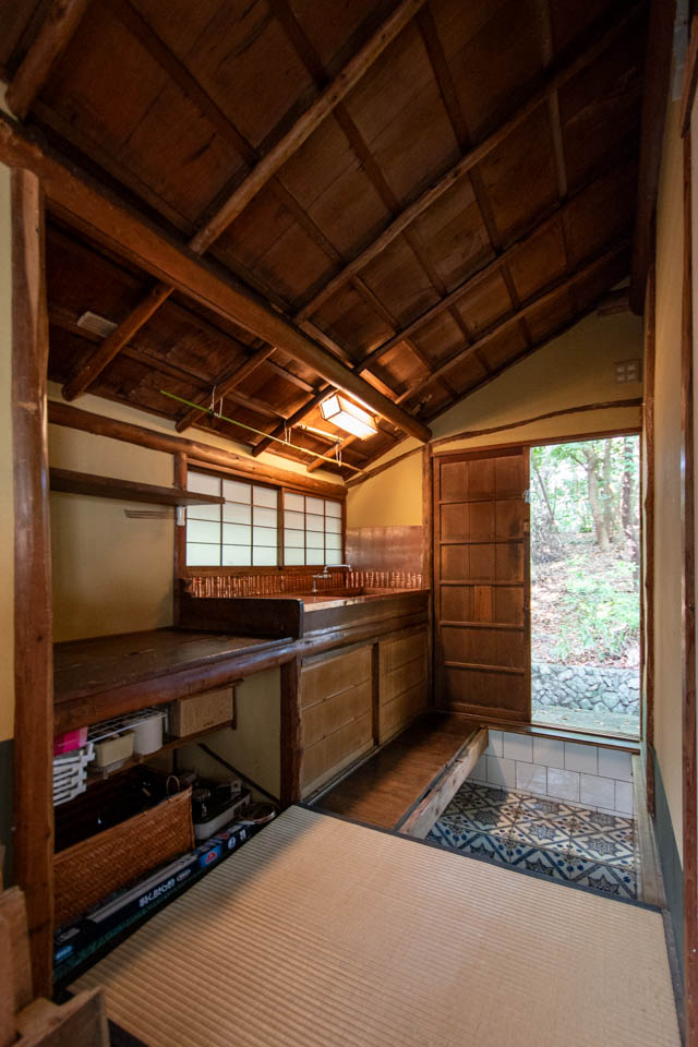 炉が1か所ある茶室です。お手洗いと小さなキッチンも完備しています。レトロなタイルが貼られた地下室があるほか、茶室の天井の梁も見ごたえがあります。窓を開けると緑に囲まれた空間が楽しめます。